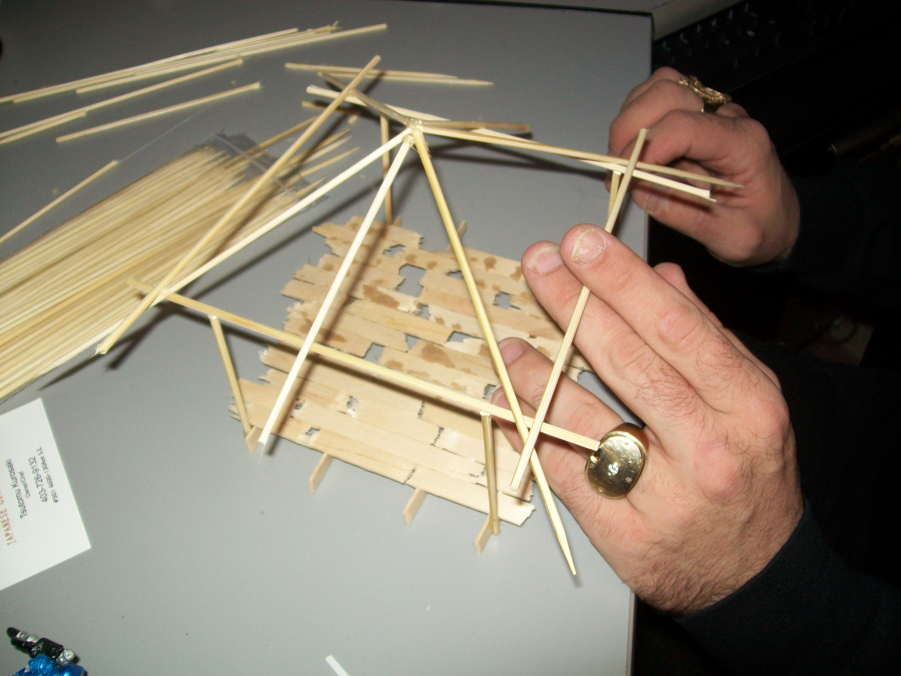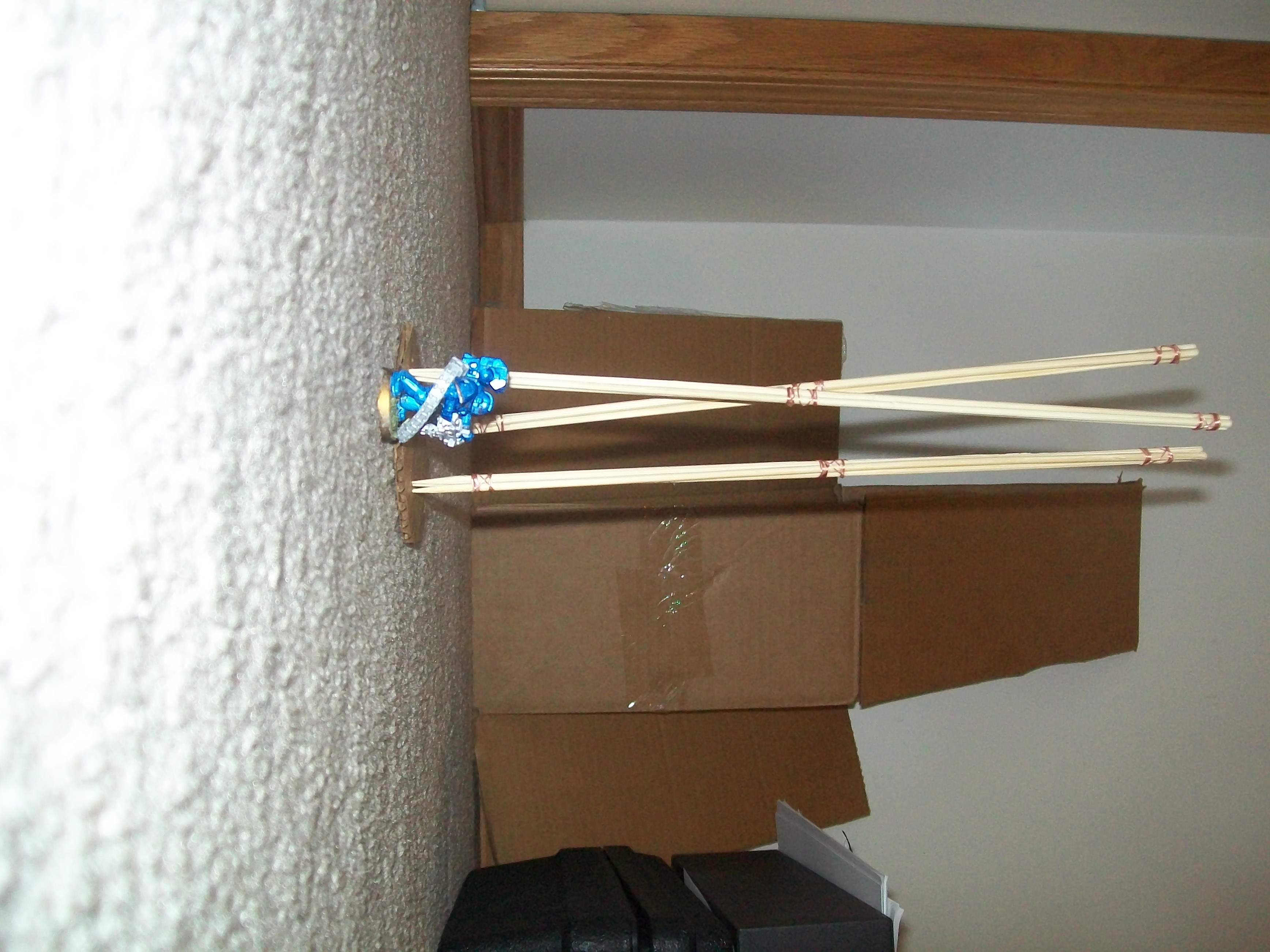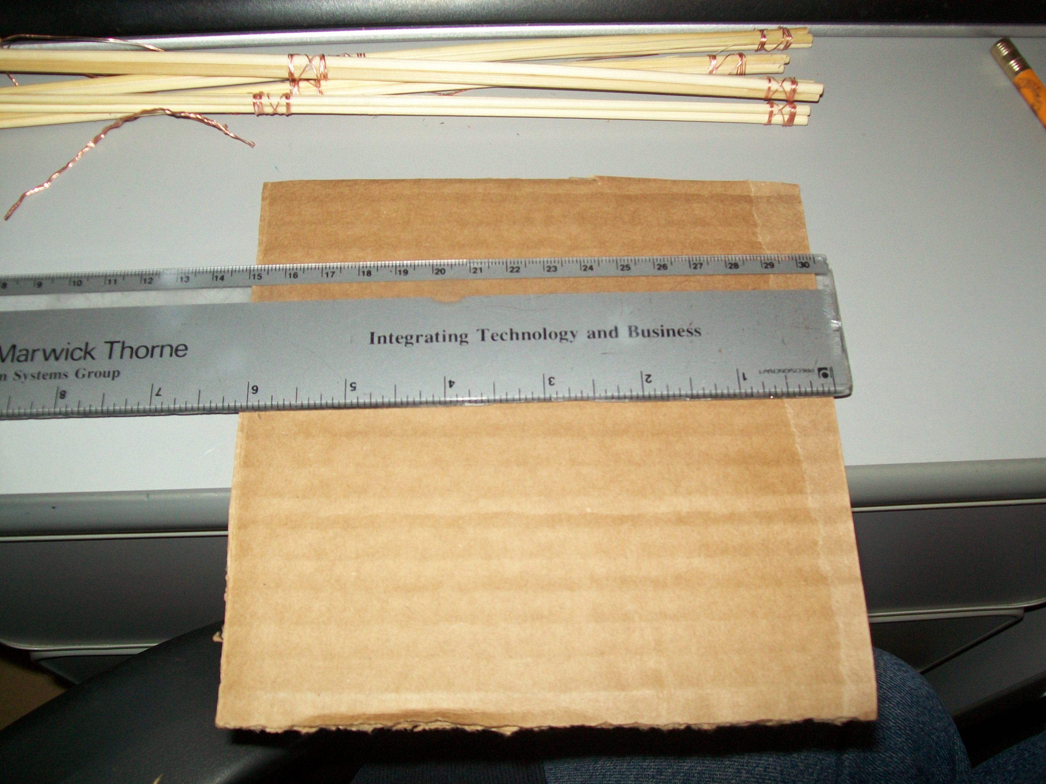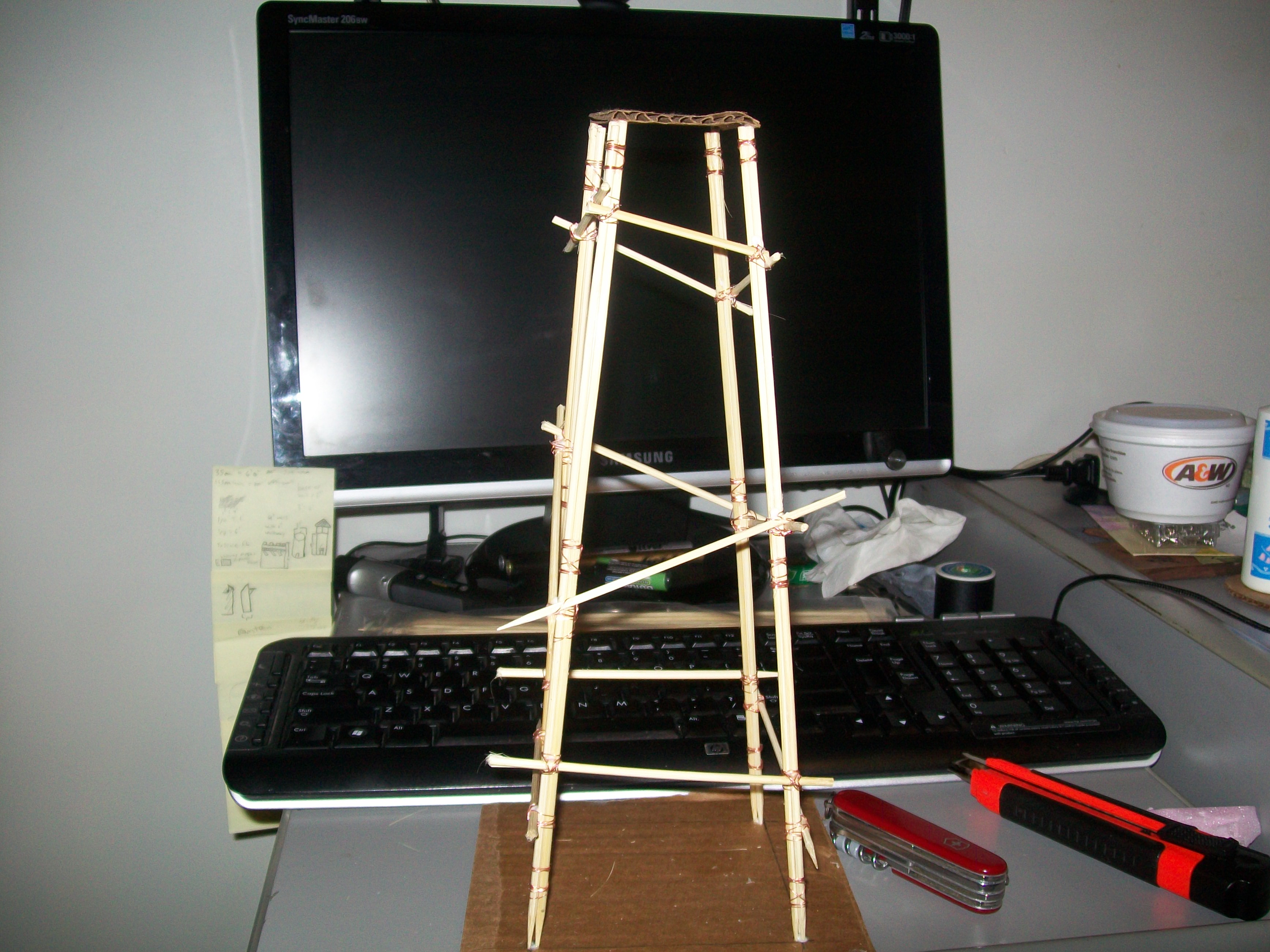 Here is the start of my 1 foot tall orky tower which will have special rules for it when I play with my friends. (Like units fire 1.5 times farther or something like that) Its made out of bamboo skewers, wire and cardboard. The first thing i did was lash 3 skewers together with the wire to make poles that looked orky.