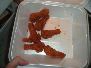 We then also went to walmart and got a few supplies. At first we had some much grander plans but decided to hold back and go a little minimalist on this. Hindsight being what it is I now wish we had gone all out for this. If your gonna get bitched at for something might as well go all the way and make it worth it. So we just got some noise makers and party hats for the wings. We also intended to get a banner and maybe a small cake for them but then backed off and just wnet with the hats and noisemakers. So we got home and dressed the wings up. We put a hat on the carton, a noisemaker in the lid making that its' mouth. I drew some eyes on it and a little fuzz goatee like my roomate has. I also went the extra mile and carved out some foamcore hands and taped them to the sides and set a beer next to it so the wings could have their birthday drink. The plan set we went to sleep.
