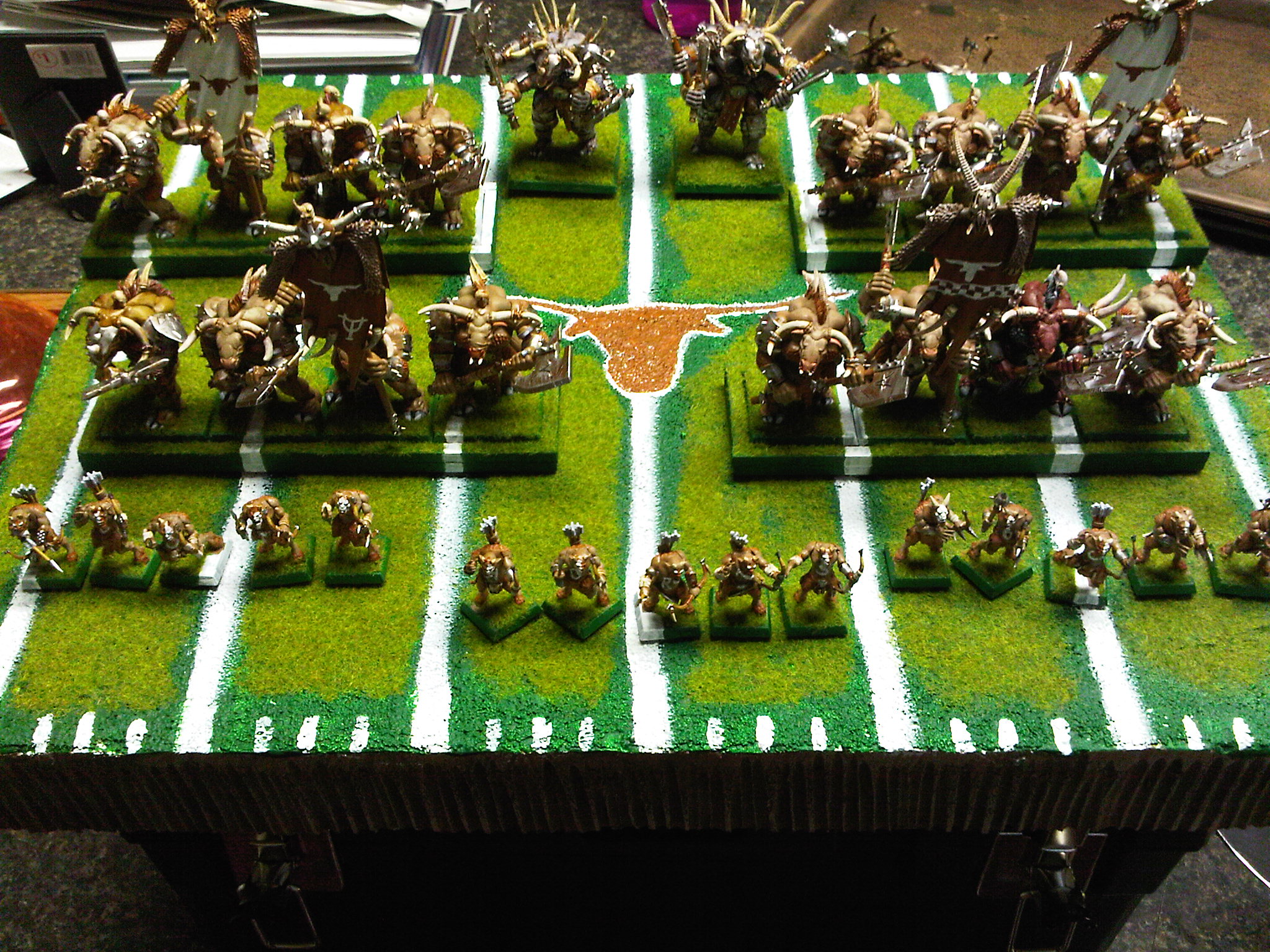 Here some pics I took really quickly with my phone. Being a TX fan, I decided to make this army Texas Longhorn themed. I played a game against a magic heavy Lizardman army and got obliterated but it was nice killing his slann. So, thus far, I'm 0-2-1. Still having fun!! More pics of battles asap.