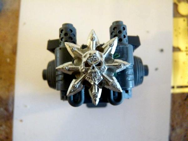 Second: I've finally decided to modify the exhaust stacks using those from the defiler sprue and to use a classic khorne icon (from the Bloodletters banner) and to place it on top of the hull.