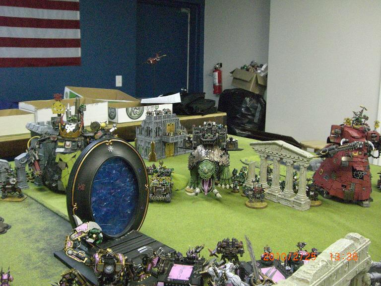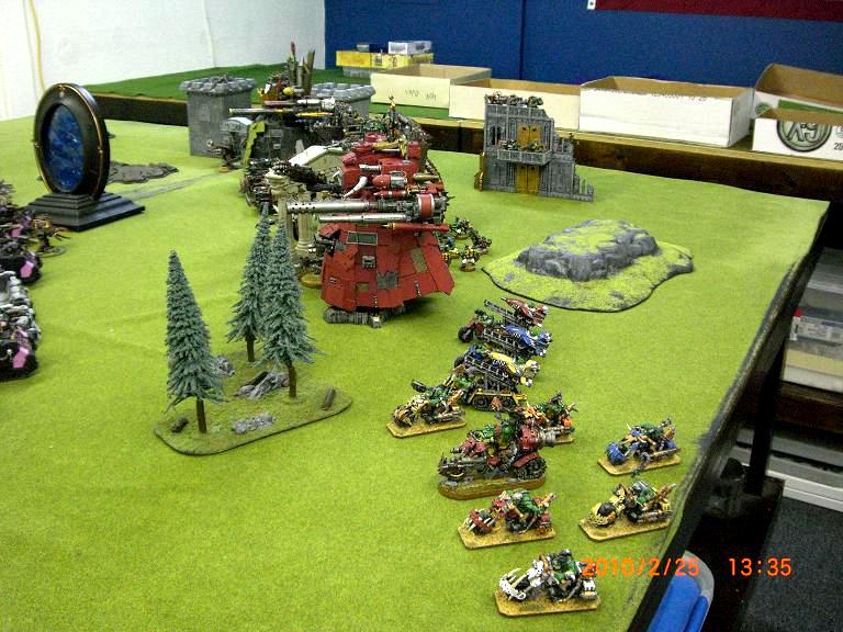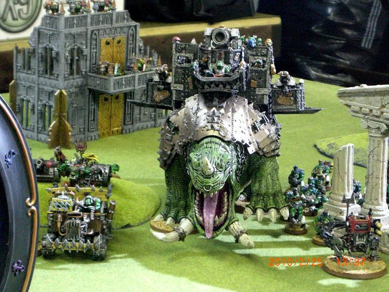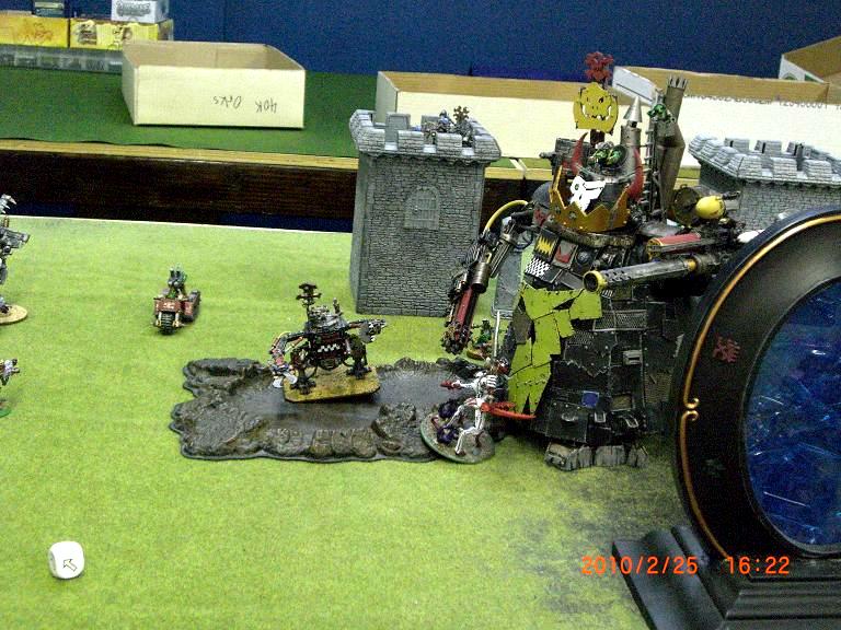 The Greater daemon finished off a dreadnought that had been harassing it, then began to work on the ork rearguard. The Baneblade, which had been wasting its shots trying to blow up the red Stompa, turned its main cannon onto the rearguard orks that had appeared with the destruction of the Goff Stompa. Its fire began to take its toll, killing half the grots and the majority of the orks. The grots took off running, shepherded further away from the objective by the greater daemon.