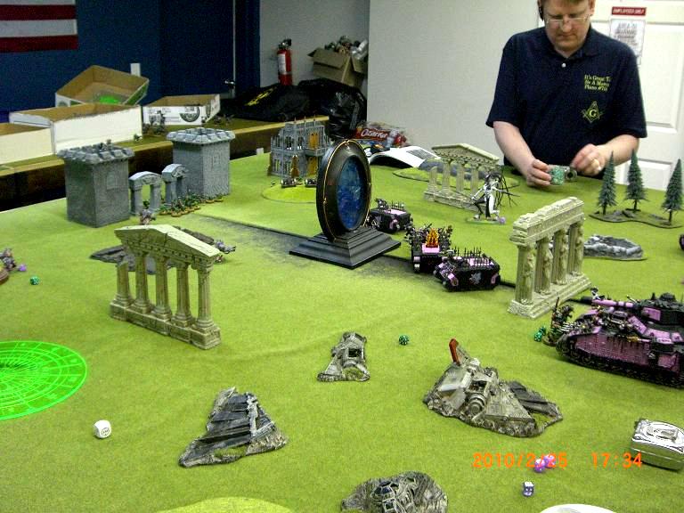 apoc rules, but when we both "bid" 30 minutes to deploy, we just decided to roll off. After setting up the table we also decided that the central warp portal would be the objective....and decided to dispense with the rest of the objectives that apocalypse usually calls for, turning this into a Take and Hold mission. We had one asset each. He chose "Rok 'em Boyz" to be orky, and I chose Chaos Altar, which we thought was fitting. The central rift acted as the altar, giving my units a +1 to invulnerable saves, or a 6+ if they had none. The terminators almost always rolled under a 4 for their saves so it didn't matter much, but it really came into play later when the Greater Daemon appeared. I need to play space marines - a 3+ invulnerable save is soooo amazing!