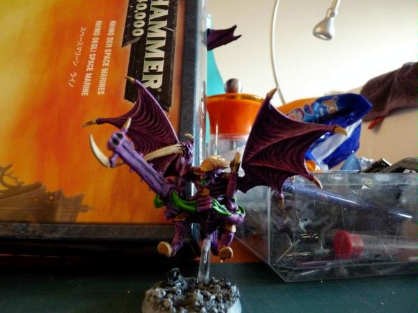 Construction: Take a genestealer body and separate the pelvis from torso. stick a sprue fragment between the two to extend the waist, then greenstuff around it. reoposition one leg and cut off the feet. cut off the ball on a rending claw, and attatch it to the leg stump. cut off and rotate the hand. cut off the gargyle's tail, and stick it on the genestealer pelvis. Add a warrior head, and cut the wings a bit before sticking them on.