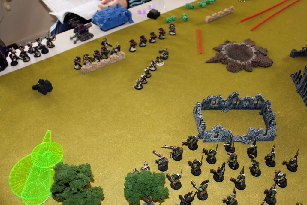 Everything in reserve for the Orks arrive this turn. The Deffkoptas move onto the board on the left flank, the Lootas with Mek and
