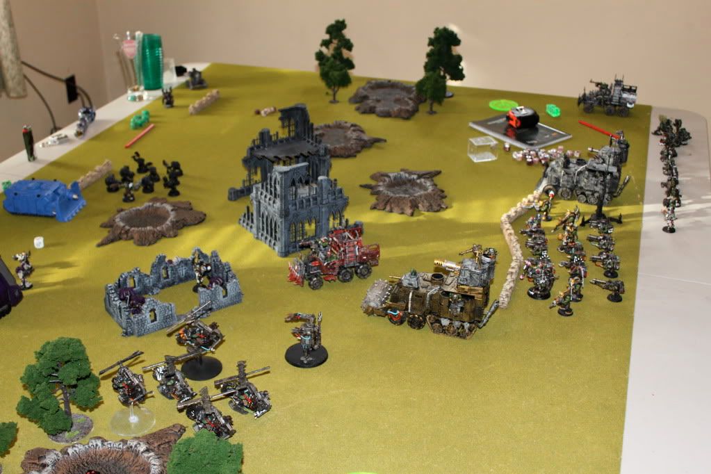 Much better round for my reserves. Snikrot, my Killa Kan, and my Deffrolla Battlewagon all come in. The Kan and the DR Battlewagon come in near the middle of the board to provide fire support to Grimskraga as well as sure up my left flank. Snikrot and his Kommandos use their ambush rule staring at the butt end of the Demolisher. If you look at the photo, his entire deployment zone is engulfed at this point. My left flank is locked down, and the right is bogged down by the mass of Orks invading his deployment zone.
