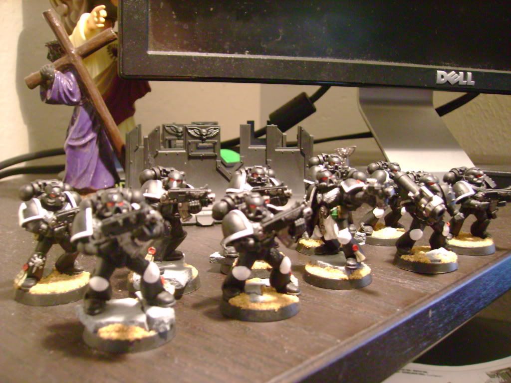 A little info on why I chose this color scheme: A good buddy of mine plays Tau. I wanted a simple scheme for my first foray back into 40K and what could be easier than black and white. I knew I didn't want to play Templars so after a quick browse through the codex I noted that the Sable Swords chapter were both, black and white, AND renowned for their many victories against the upstart Tau empire. Score! Well, until 3 days later when my buddy decided to pick himself up a nid army...