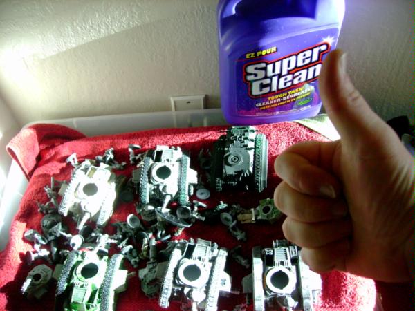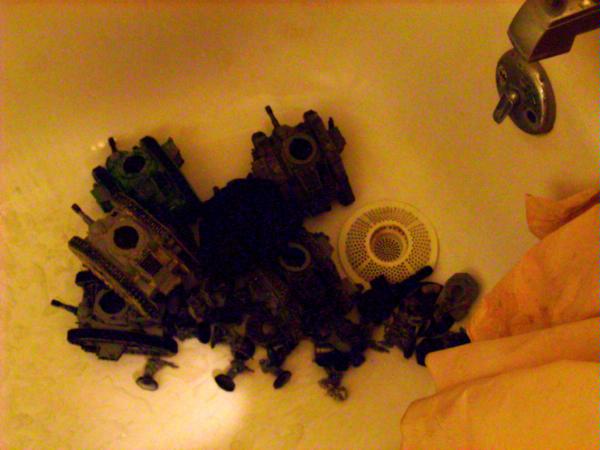 So I've finally gotten around to doing something about the box of IG collecting dust in my closet. The boys were from a mish-mash of new kits, trades off the swap shop, and ebay. This meant that they came in a large variety of states of paintedness :( following the Dakka Tutorial I decided that for a good start my boys needed a bath of about an hour: