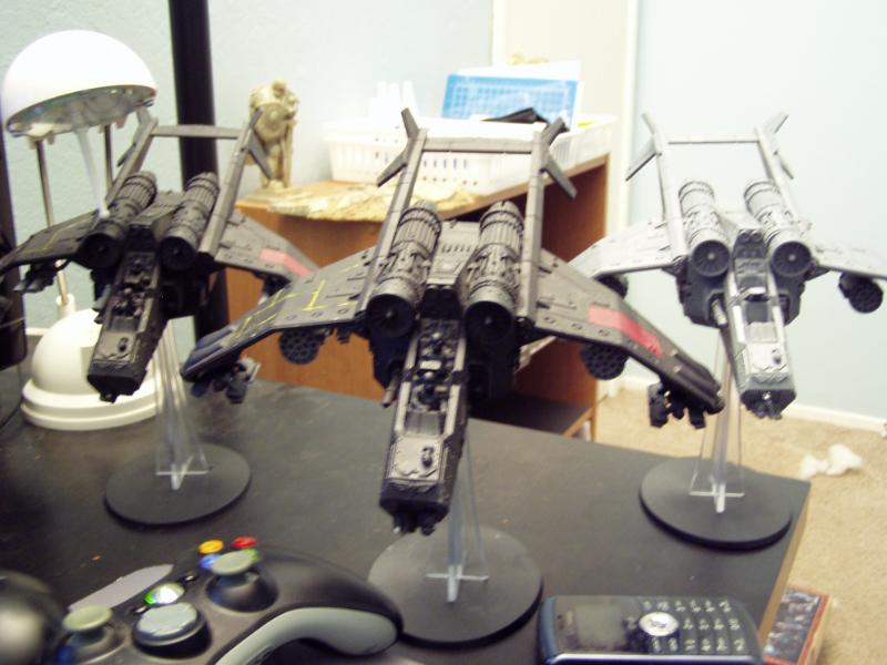 For being table-top models I'm pretty happy with how they came out. Before anybody asks, there is a reason why one has a white stabilizer and airfoils. When I was in the military all of the squadrons I worked at designated one aircraft as the squadron commander's "bird". I worked on H-60 variants and the tailcones were usually painted in the squadron's colors. While I didn't want the speeder to look like a checkerboard (half white/half black) I did want to give a subtle nod to my airframing days. I think it works to show just who's running that little detachment and I'm considering it an aesthetic test run for when I get around to painting up my valkyrie squadron.