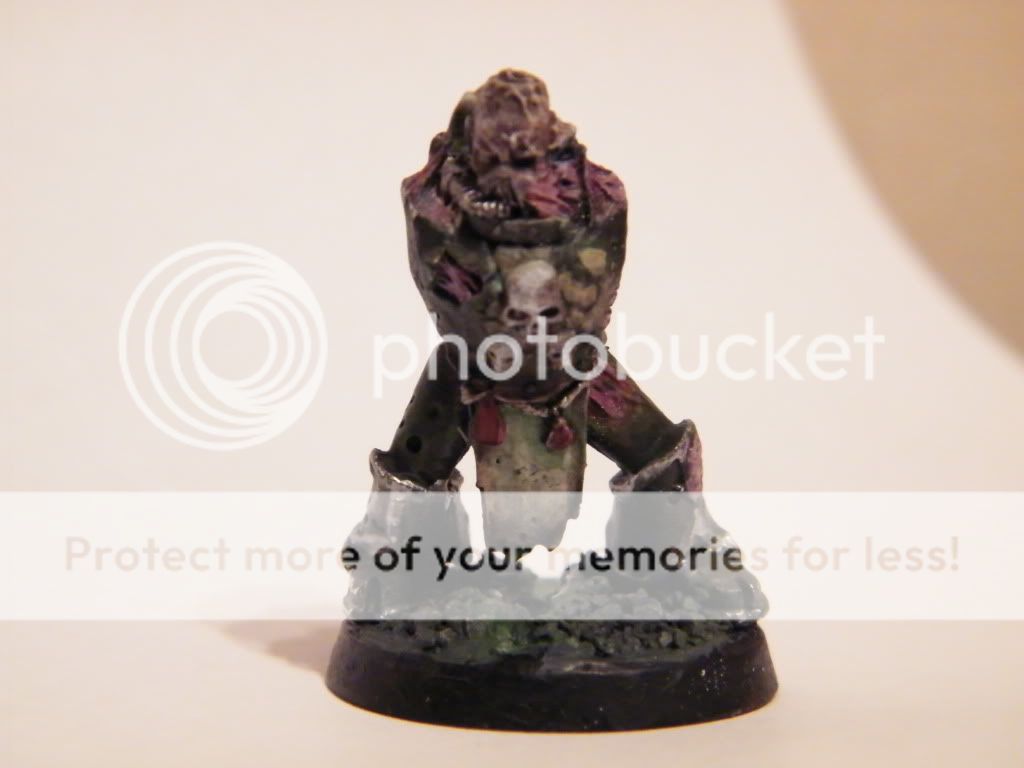 I dont know, I started to like him without the arms, but here they are now, with some more painting done. I took pictures from other angles too but for some wierd reason the first one was only good one. Anyway, now the champion mutated a powerfist for himself, which also was my first conversion with gs, which did not work out that well, but luckily with nurgle the uglier the better, specially with pink/purple powerfists  I see some flaws in the painting now which came from the model hitting the table, need to fix them but apart that its starting to look good. The base is still horrible, luckily it is hidden, need to come up with something nice for it. The stuff in front of the base is not glue, its snow, as is the shiny parts in the model, had a little snow accident while taking the photos. Thanks for the comments guys