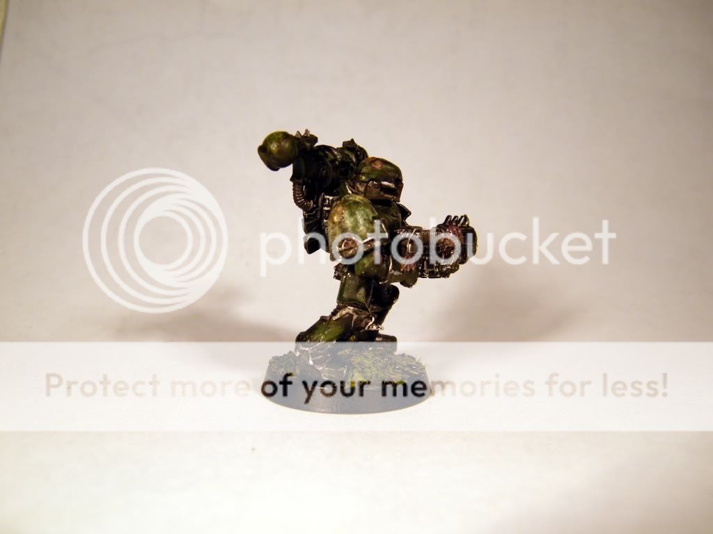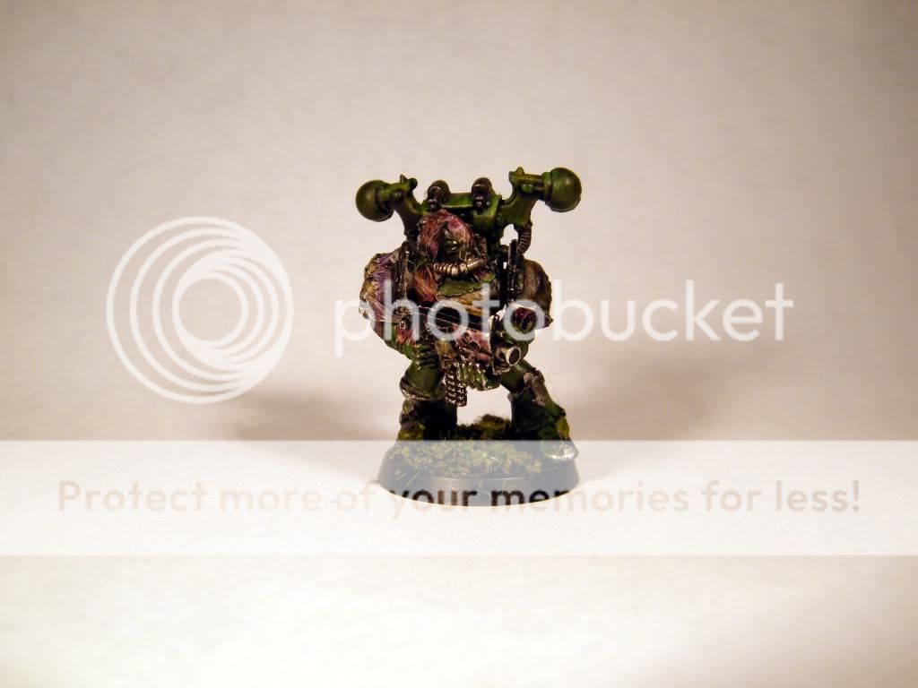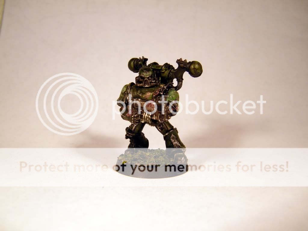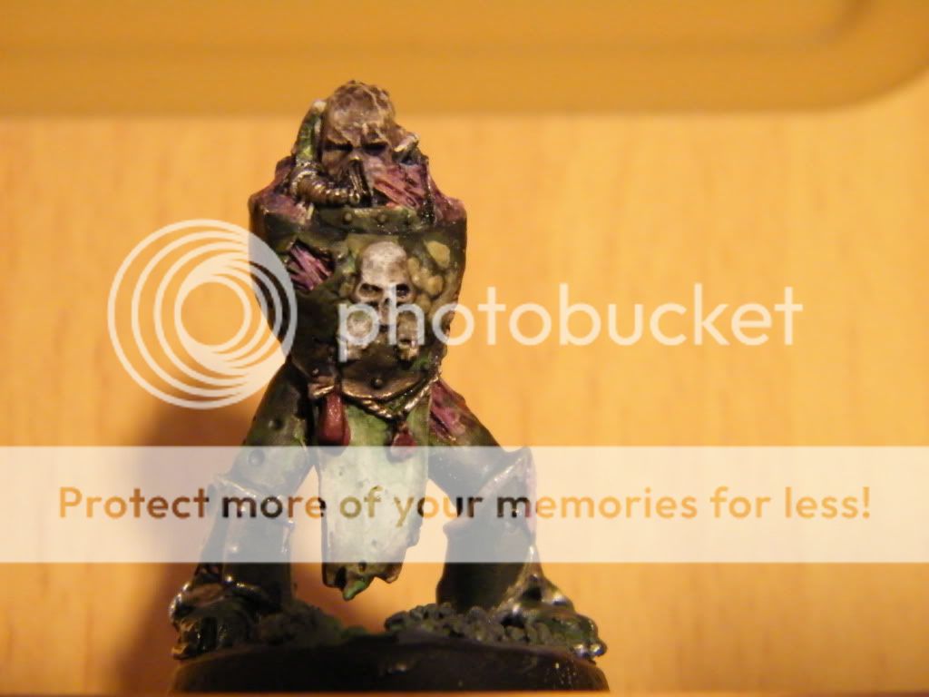 Here is the start of my new nurgle army, after not been painting for half a year this one worked as my training dummy. As for the mini im not sure if im satisfied with it or not, the robe and the chest ended being good but dont know about the rest. Still not sure with what color im going to do the highlights, the silver that i've used now doesent seem to be working that well after all, and maybe some more contrast for the green would make it. I also had troubles getting the head not to look like for being from another model, the shape it is now is only result for covering one bad attempt, even though it ended up ok as it is now, some more work for the eyes and the mask part would make nice difference. The legs ended up being quite dissapointing, tried some tricks there which didnt work out at all, luckily the shadows are covering them  . Not the best, not the worst but atleast after a brake im feeling good to continue painting the rest 2 squads with this scheme. Hope you like it