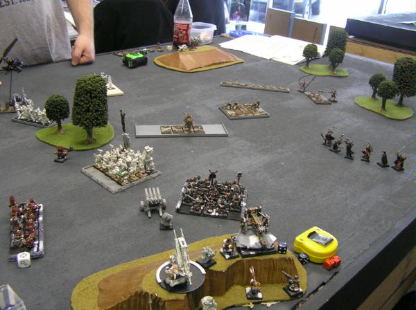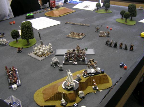 Cold Ones lost by a ton, and fled off the board through the shades who held, while both units restrained pursuit. The gyro threw baggage overboard and crushed a crossbow. Warriors were far too winded from their run to hurt elves, but ran them off anyhow.