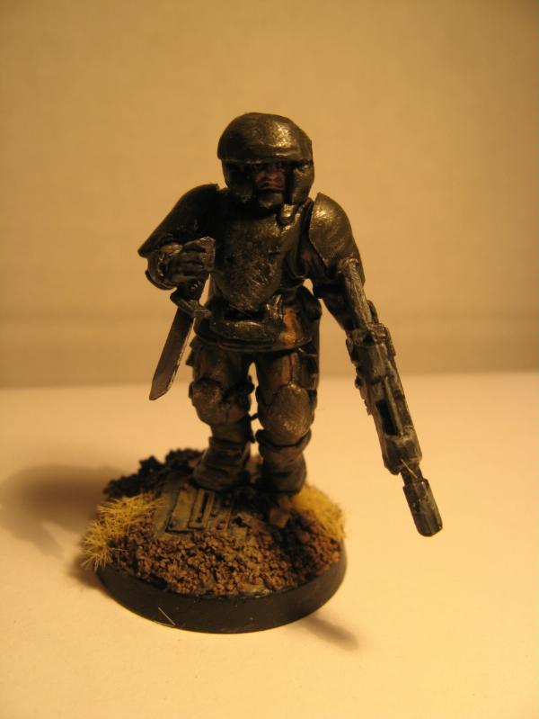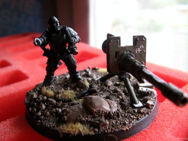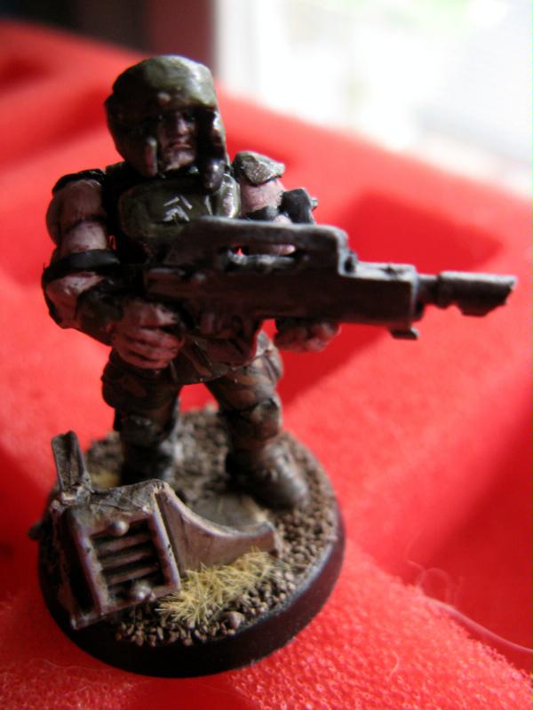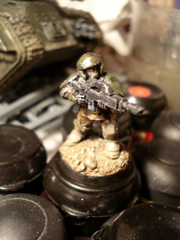 Anyways, a small update from me (since I have been sidetracked due to a certain gig on Sunday that totally destroyed me for the past few days). Manged to finish another infantryman, aswell as work on the autocannon team, which still needs painting. Pictures! The photography makes me all too aware of mistakes I am making, such as uneven coats of paint, thickness and so on but from about 12 inches away it looks fine to me.