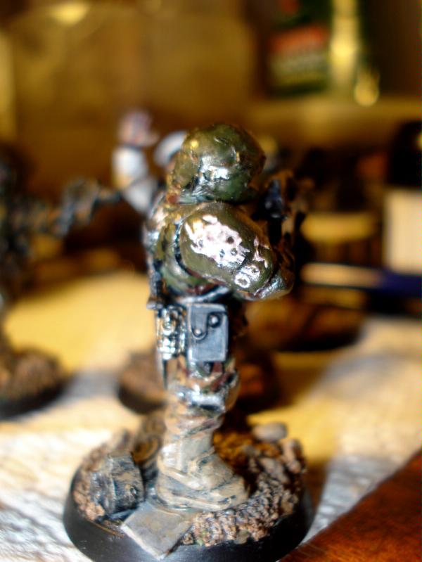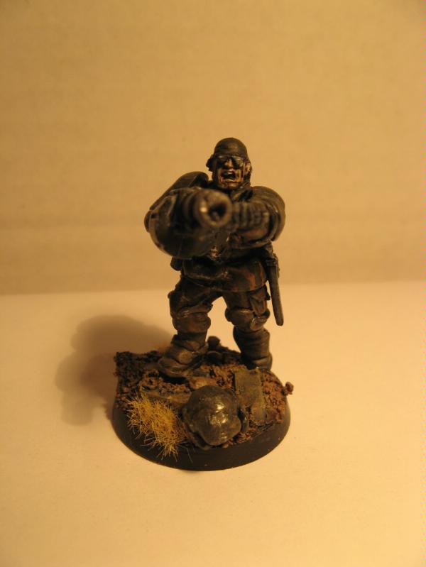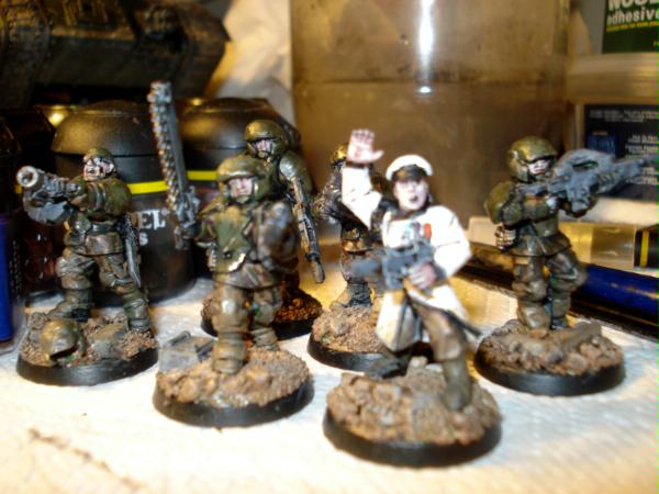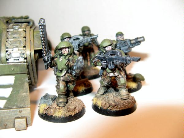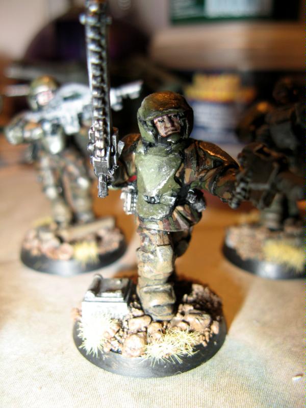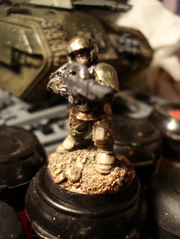 Yep, I am aiming to try and make the guardsmen look very weathered, like they've been fighting on the frontlines for some time, so the armour is chipped, beaten and worn and their combat fatigues are caked in dirt and grime. Whilst the models some of the time look fairly single toned I am happy with the overall effect (and the white symbols on shoulderpads, added after engagements do help to break up this monotony).