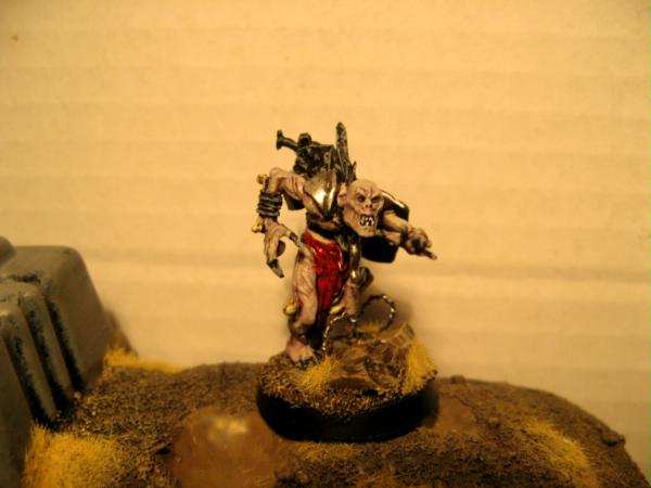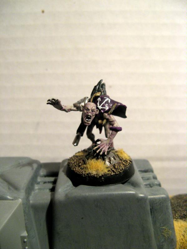 Another small WIP update. I've decided to add a 'veteran cultist' squad to my forces, along with a chaos space marine wielding a heavy bolter. My inspiration again from comes from Migsula's incredible Alpha Legion and so I have based the models off ghouls with some greenstuff work. Some WIP pictures follow. The whole idea was if a cultist had survived for a long time they would have performed alot of summoning rituals (as per Word Bearer fluff), and so their very life force would have been sucked out as a result, leaving a sortof shrivelled husk that would continue to serve with their commanders. I wanted to convery a sortof ' de-evolution' of the cultists I'd made previously and so these veterans still retain the capes and shoulder pouldrons of their forebears and cousins. In addition, serving chaos for a long period of time would surely result in severe malnutrition!