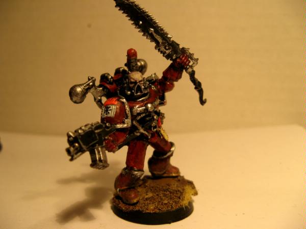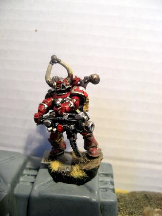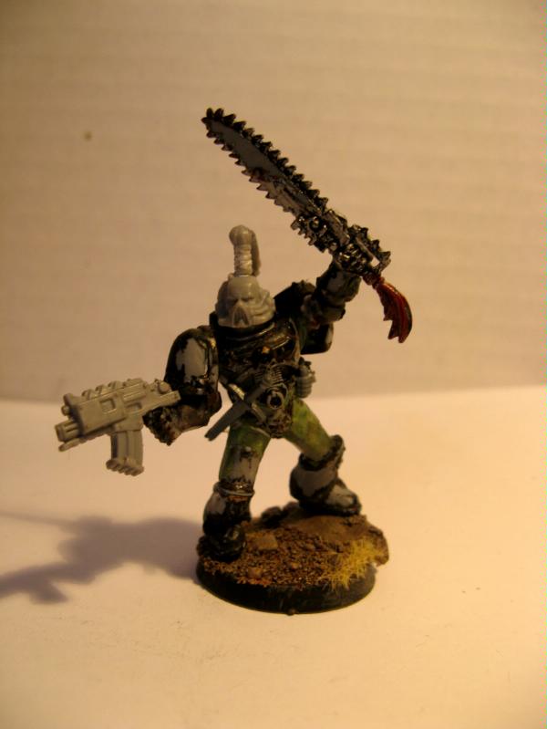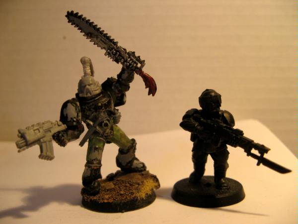 Well, I have continued to make more soldiers for the 14th, and currently need to finish painting five troopers, a Captain and A sniper specialist. However, before this progress can ensue I have managed to be massively sidetracked! I decided to try and make, and paint a single model in a day, feeling I needed a break from Marine Green! So I came up with this: Coryphaus: Praenuntius. A tru-scale Word Bearer Chaos Marine. The painting isnt quite done yet, but you get some idea. Please suggest improvements though! As such I also now intend to have a go at some Chaos Led Renegade Guard, simply called 'The Whirlwind' and inpired by yet more Steven Erikson novels aswell as the Word Bearer fluff of having hundreds of cultists at their beck and call and last but not least Dakka's very own Migsula! Anyways, pictures!