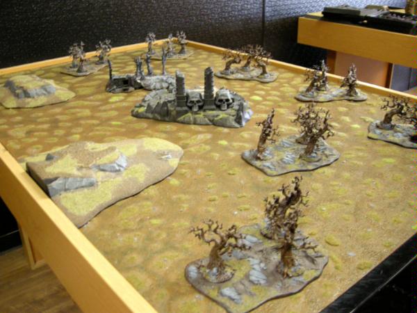 We got 4 objects. We placed one pretty much in the middle, two more ended up in what would become my deployment zone, and one to the the table quarter to my right. We rolled for the area terrain (as per Scorched Earth). The top 3 forests (in the picture above) started to burn as did the middle two, making them dangerous terrain. The rest were just smoking, increasing their cover save by one.