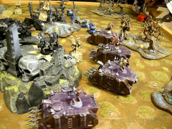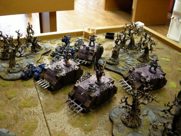 He deployed his bikes to avoid the now flaming trees, and set his rhinos up to head towards the objectives. All his obliterators are in reserves.