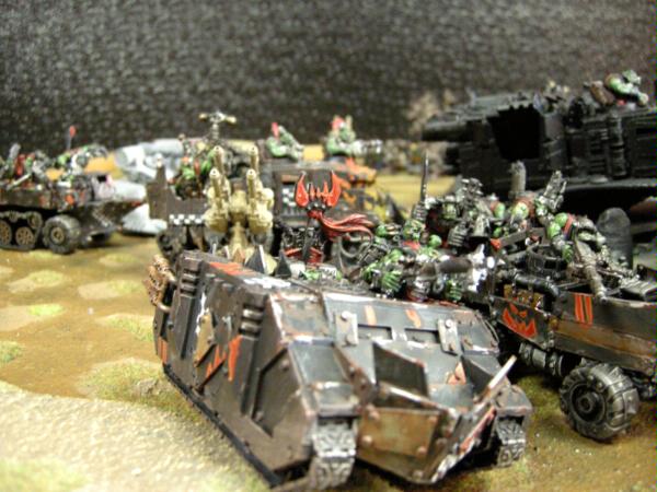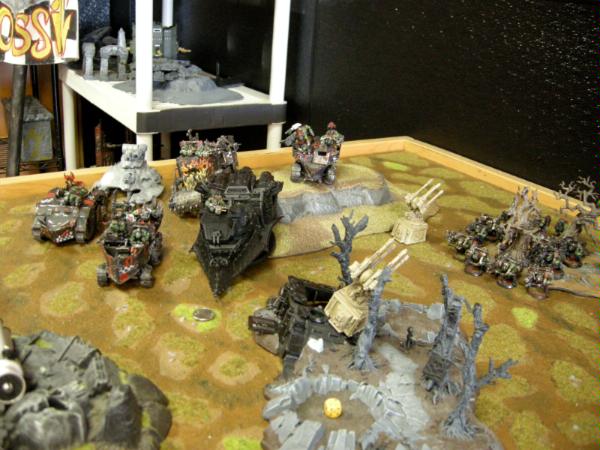 I deployed my Lootas in 3+ Area terrain. Most of my trukks and battlewagons ready to head into fight. The Big Mek and burnas are in the battlewagon with the deffrolla, and nobz are in the other. Looted wagon in the back. Also the autocannons are the objectives, there are two more to the left, off camera.