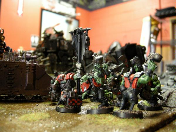 10 Nobz w/ 3 Power Klaws, 1 Waaagh! Banner, 2 Ammo Runts, 3 Kombi-Skorchas, 3 Big Choppas, Painboy, all with cybork bodies, 'eavy armor, and stikkbombz
