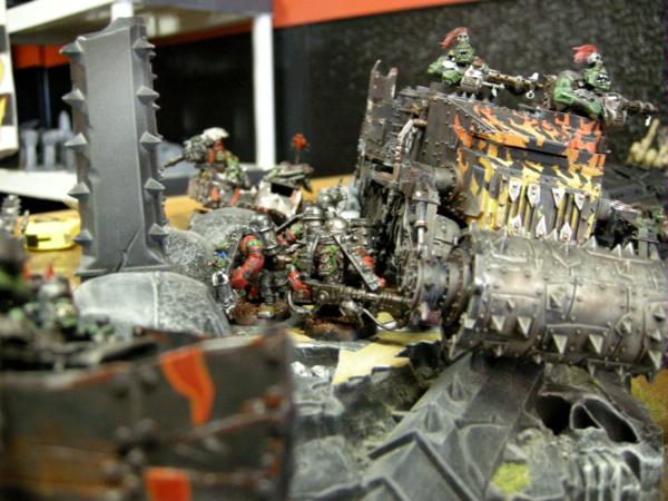 The last oblits squad came in and landed in between my nobz and lootas. He moves his lash sorcerer back a bit and disembarked with the plasma plague marines. A second rhino disembarked its passengers who move their flamers towards the front, facing my Nobz. His lord is also in this group. His Meltas missed or failed to penetrate my Burnas battlewagon. He fired pistols and flamers into my Nobz doing 2 wounds. His oblits shot twin linked meltas at my nobz, killing one. He rapid fired his plasma and bolters from the other squad and botlers killing 1 and wound 3 more. At this point Powerklaws, Big Choppas, a regular nob, and the painboy remain. I WAAAGH!! to avoid a leadership check.