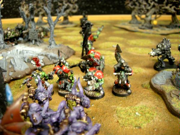 RapidFireText: Well this game I had rolled badly but my generalship needed work too. I should have tried to have the orks overextend himself and deal with them one at a time. It really came down to whose army was better up close and it definitely made sense the orks won. Could've used my bikers better instead of making a beeline for the lootas but they ended up dying fairly quickly. Also definitely sad my lord whiffed twice in a row. Game still woulda been a loss had he done better though. Overall very fun game and showed me how to use my army better.