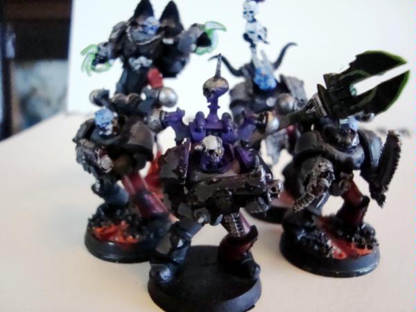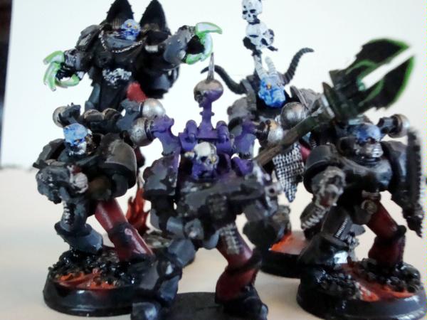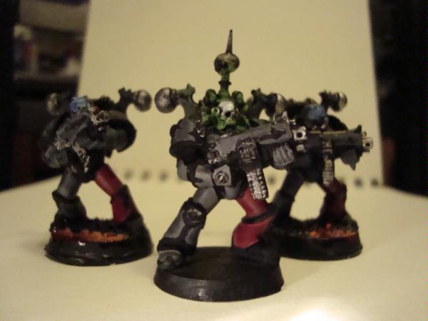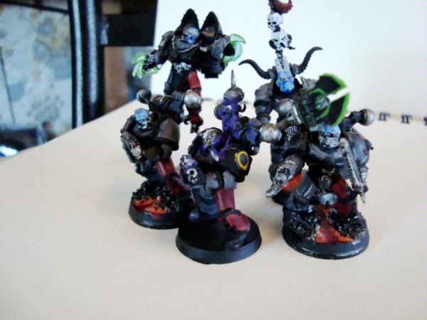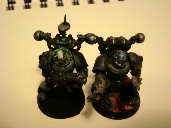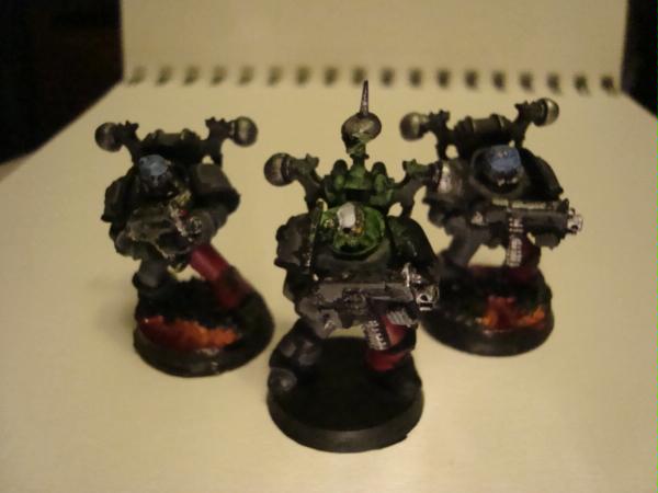 Hi everyone, been gone a long time, but with the whole adepticon weekend i got inspired to get back to work on my minis. Id like your opinions on something. The model pictured in the center is a test paint for my squad of 1000 sons. First question: how is the light sourcing and do you have any advice for improving it? I'm going for an inner glow coming from inside the armor. Second question: is the green a decent color to use? the other two marines pictured is a good representation of my standard marines, helmetless with pale blue tint to the skin. I want my 1000 sons to stand out from the others, but im not sure if im sold on the green. i debated on using a purple color as the rest of my marines have purple glowy eyes with a pinpoint of yellow, at least thats what i was attempting. I think the modeling aspects separate them fairly well with the servo skull heads and more ornamental backpacks, but i wanted that source lighting to make them stand out. I know my painting is substandard, and i apologize.... Question Three: I am debating on painting one shoulder pad in the thousand sons scheme blue and yellow/gold maybe. do you think it would be better to keep the shoulderpads matching the rest of the army, and perhaps change their single leg color from the army typical black/red to blue/gold... I'm kinda stuck, i do like the test model a fair deal and am kinda reluctant to add the blue/gold to my army. Does the green glow clash too much with the blue headed typical troops? As always thanks for your opinion /smile.