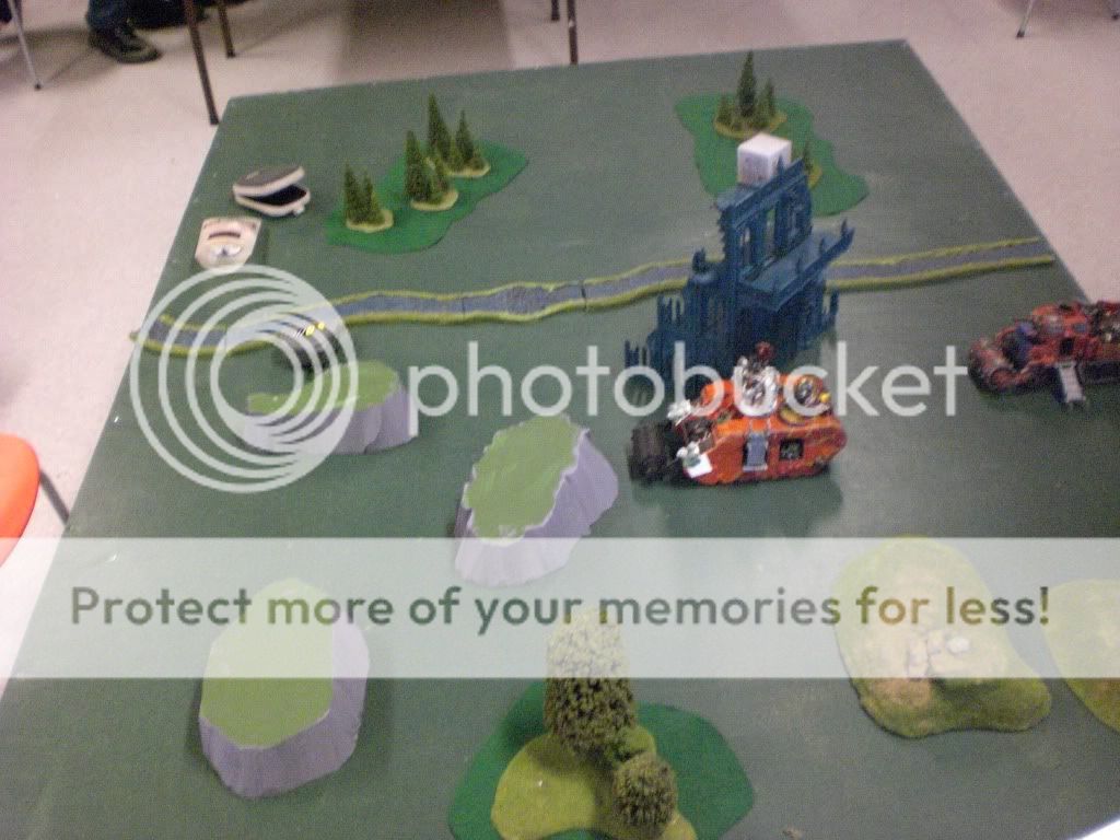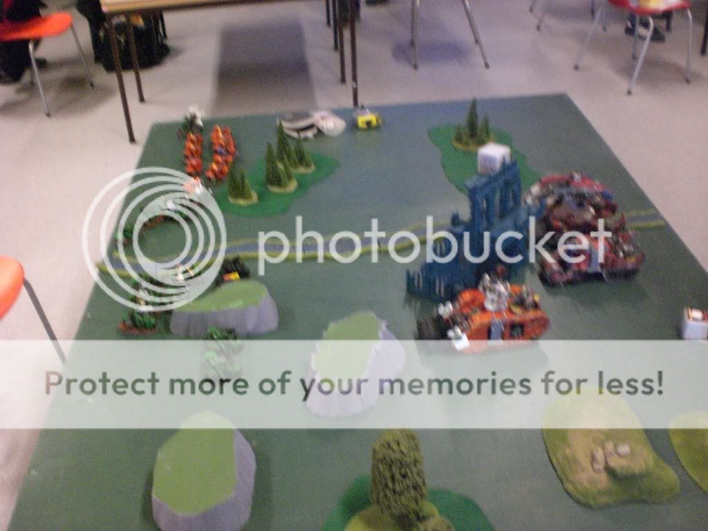 I start with most of my army in reserve, and he does the same thing, setting up a firebase across from me. Again I have already made some bad mistakes (still havn't eaten anything at this point). I should have chosen a different quarter, as the river blocked me from turboboosting. I should have started with everything on the board, and I should have bum-rushed in, using one unit to screen as the rest could take out his tanks, and then I could have retreated and harrassed him after his long range firepower had been diminished.
