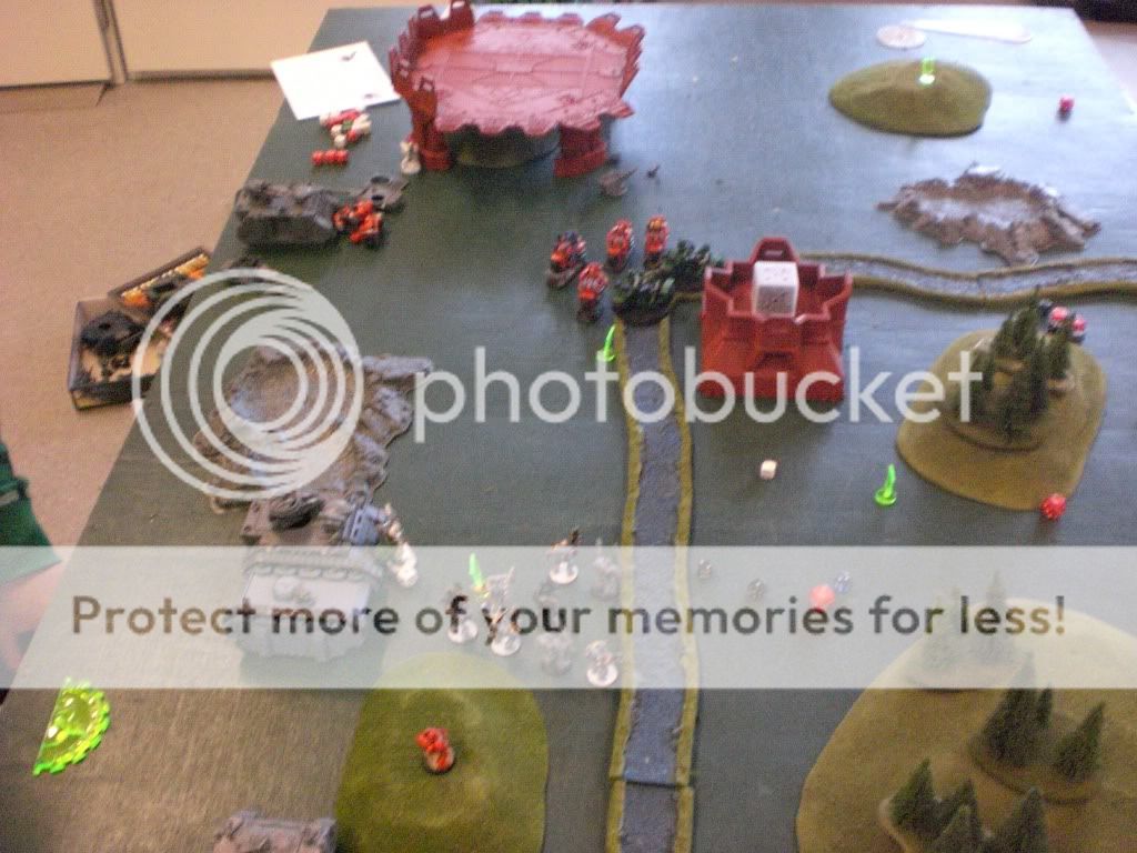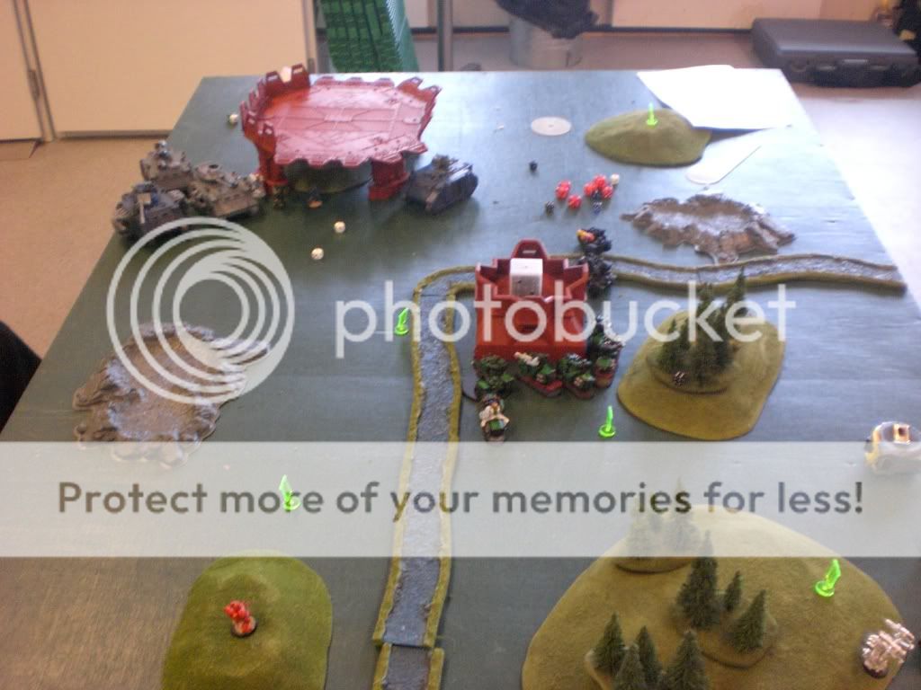 KFF. I choose to place on thunderfire on each flank, hopefully splitting his force, so I could concentrate on some of his forces as I removed his mobility. I did however make two HUGE mistakes in my first turn, that ended up costing me the game.