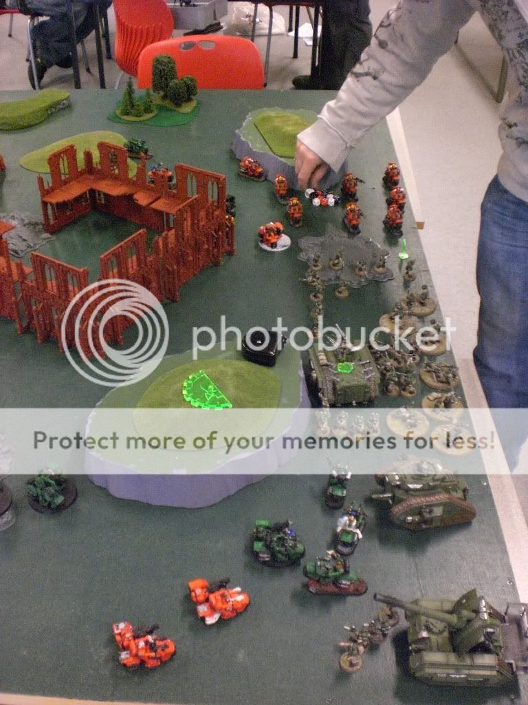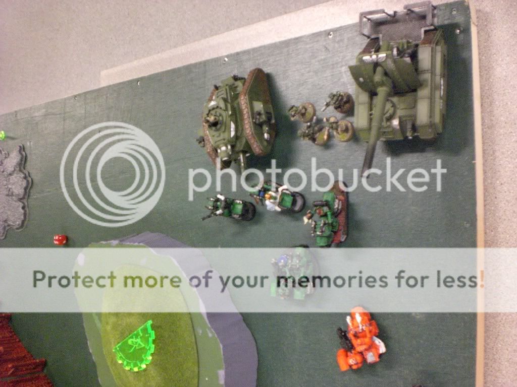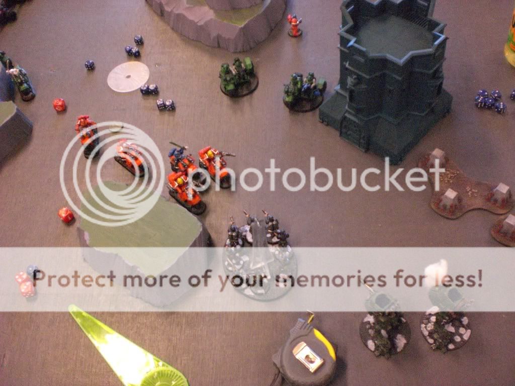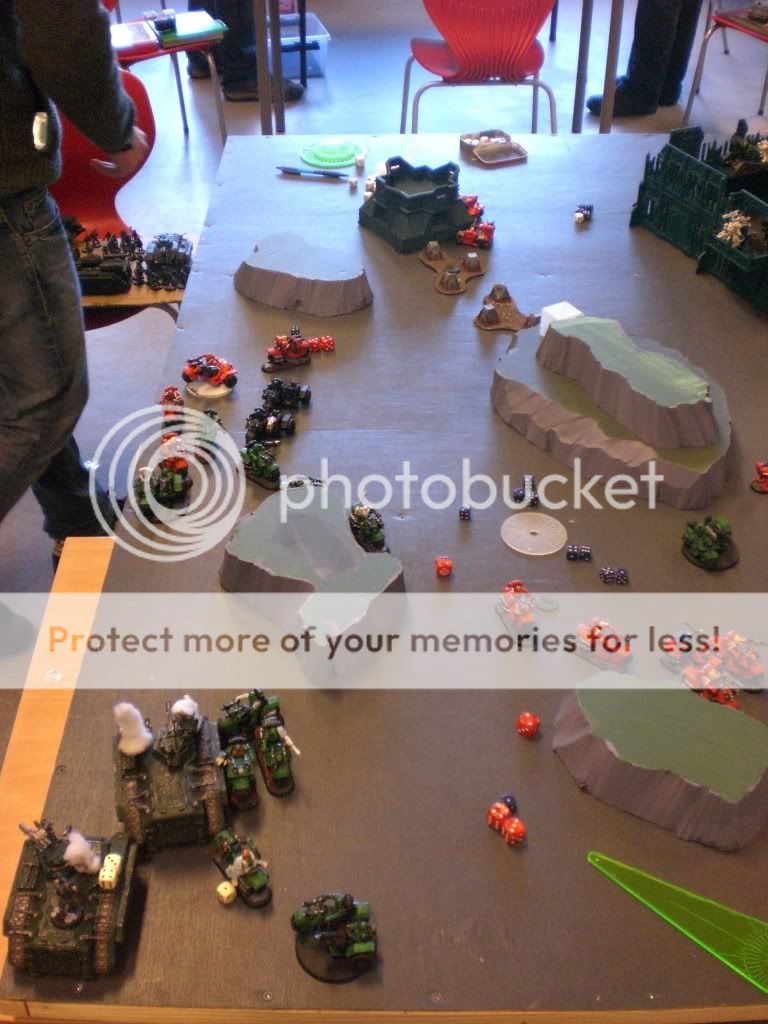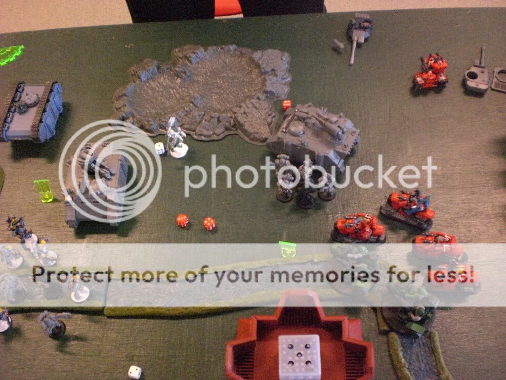 Of course, I didn't do this. I started moving meekly forward, waiting for my own reserves and being afraid of his. I did take out 5 of his long fangs, but here, my luck ended. He hit with EVERY lascannon shot (fact! My opponent commented on this himself), and even that lone long fang left just kept knocking out a bike a turn. Then add that when I penetrated his tanks, I didn't get any destroyed results, and my army was quickly shrinking away, while his was more or less unharmed.