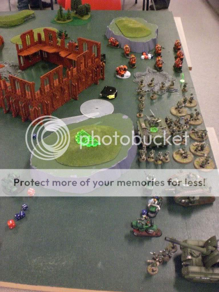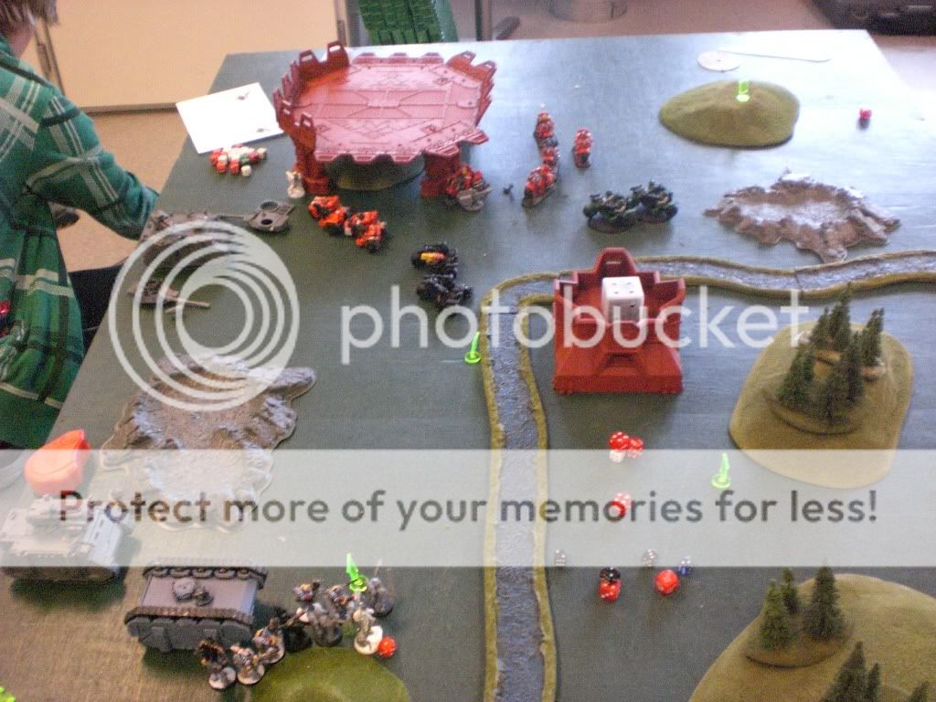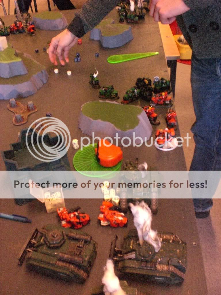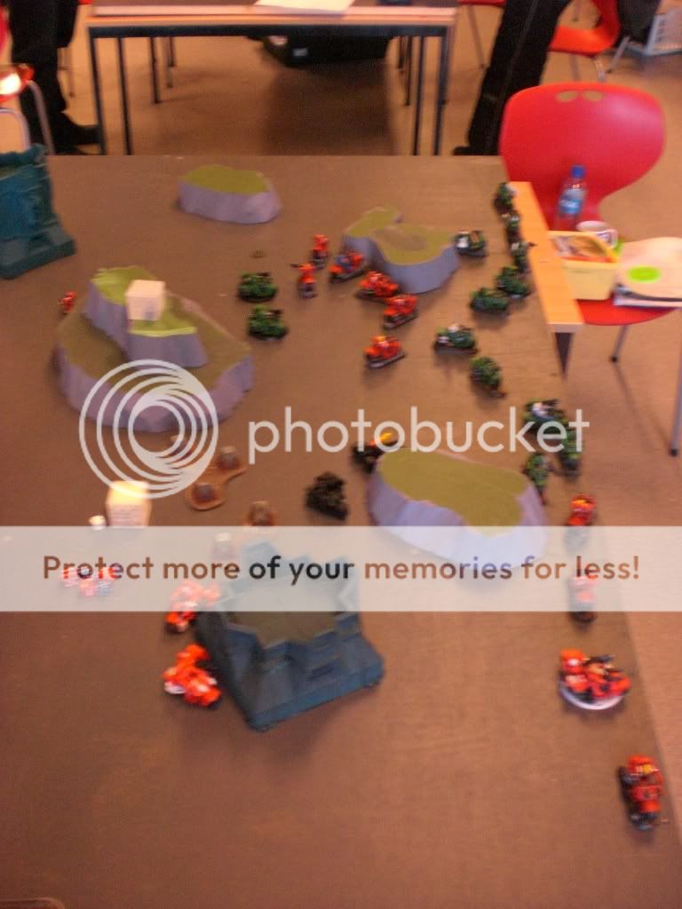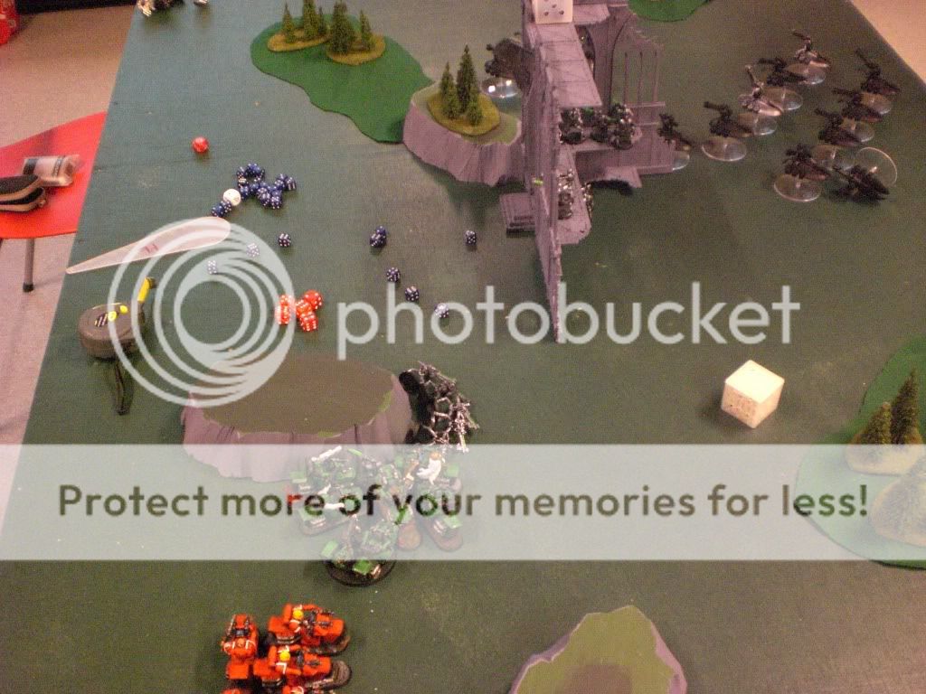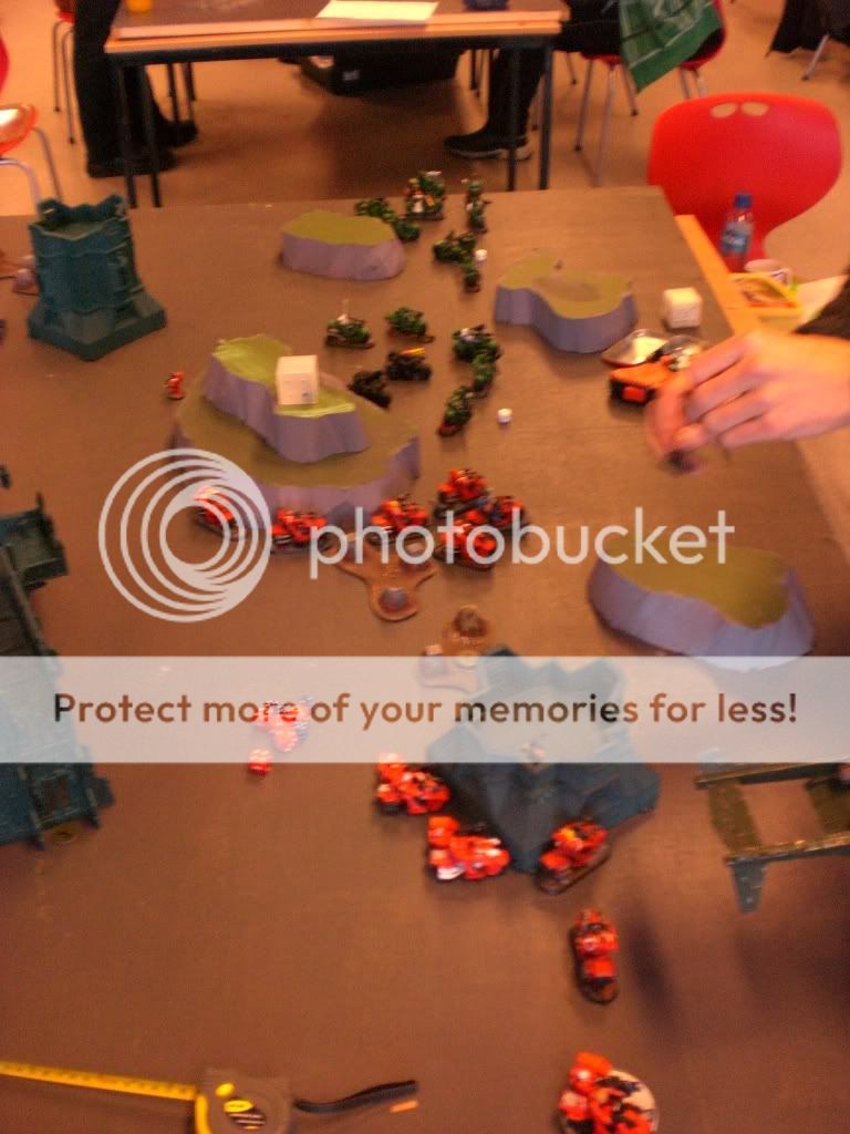 Of course, I didn't do this. I started moving meekly forward, waiting for my own reserves and being afraid of his. I did take out 5 of his long fangs, but here, my luck ended. He hit with EVERY lascannon shot (fact! My opponent commented on this himself), and even that lone long fang left just kept knocking out a bike a turn. Then add that when I penetrated his tanks, I didn't get any destroyed results, and my army was quickly shrinking away, while his was more or less unharmed.