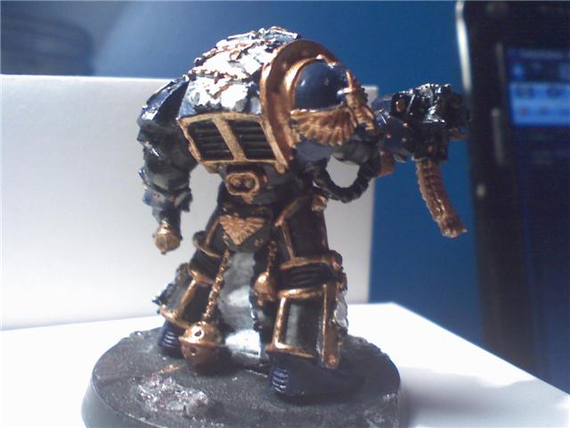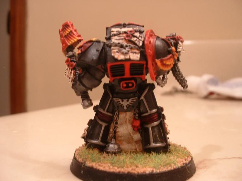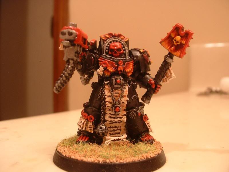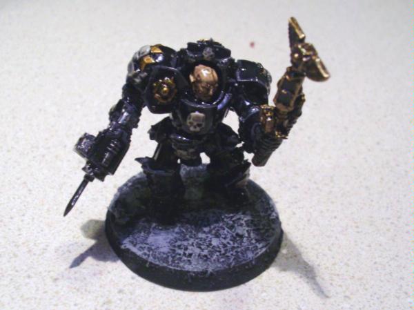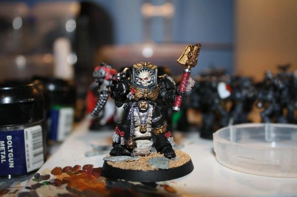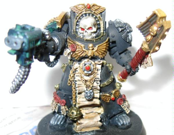 This be my attempt at painting the chaplain in terminator armour. He's not quite as shiny anymore metals wise, and I've since finished up the gems I missed since taking that photo. Of all the models I've ever painted, I'm probably happiest with this guy. Yes, the base is intentionally unpainted.