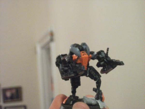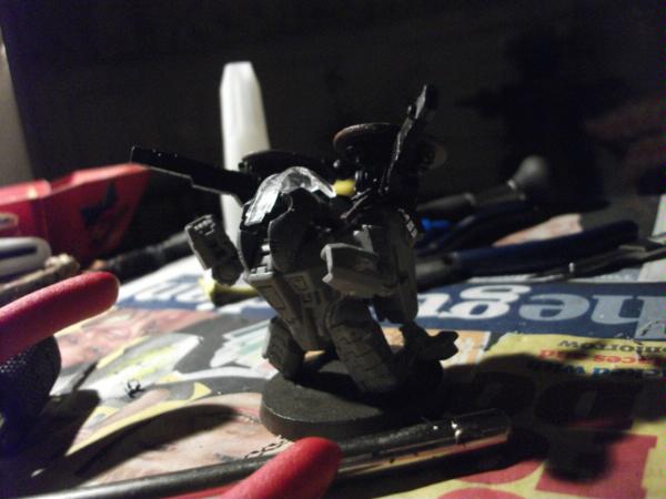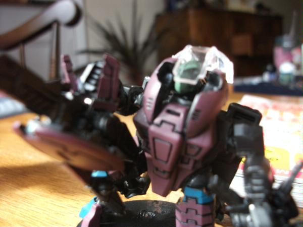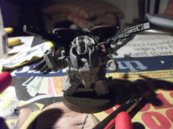 This conversion idea come about for two reasons. Firstly I had seen some incredible conversion work done on Tau suits to fit them into a Kroot army by a fellow called stayfrosty (see http://stillfrostyconversions.com/?cat=4 and http://www.dakkadakka.com/gallery/7761-Brandon%20Vallee%20Kroot%202.html?m=2&w=600). Secondly, I recently played my Salamander acquaintance who fielded 4 dreadnoughts. “Fine” I thought, as I laughed at the thought of my broadside unit easily claiming 4 kill points. The trouble was that my shield drones got blown up and the broadsides fled the field in disgrace (not for the first time). So instead of buying more broadsides at £18 a pop, I thought I would try and convert some of the numerous crisis suits I have lying around. You can easily pick up crisis suits for £6-£7 on ebay as they are much more common than broadsides and don’t have the metal parts. Stealth suits and Sniper drones tend to be cheapish as well as people buy them because they look cool then realize they’re among the most over priced fragile units in the game! Anyway…. Material: 1 set of crisis suit parts, preferably half melted by excessive poly cement 1 stealth suit body (both halves) 1 kroot head 1 canopy, stolen from a model aeroplane kit 2 Magnetised Sniper drones Several 3mm dia. magnets Several 1mm dia. magnets Tools: 1mm hand drill 3mm hand drill (or ‘pin vice’ as Brother Bartius would say) Paper clips (or other, more professional pinning) Superglue Poly Cement Sharp craft knife Snips Pliers Step 1: First thing is to take apart the crisis suit, which had been welded together with far too much poly cement. I had to use the pliers to break the legs off in order to re-posture. Be careful where you apply the force as it’s easy to break the leg instead of getting the leg detached from the torso (I did this!). Nothing wrong with a bit of battle damage! Step 2: Cut the lower leg off just below the knee joint, using a craft knife to follow and cut the curvature of the knee joint on both sides, and then using the pliers to break the lower leg off from the main leg. Step 3: Chop the foot off the lower leg at the ankle ball joint (again the previous owner had pretty much melted the poor thing). By now you have a torso, 2 detached legs, 2 lower legs and 2 feet. Step 4: Decide what posture you want. I decided this guy would be kneeling so there was a bit of slicing of the hip leg joint using the craft knife. I didn’t bother pinning these parts. Step 5: This is a good time to magnetise his hard points – drill into the groove that is already there, this will save some labour. Step 6: Drill 1mm hole into foot and lower leg. Pin lower leg at the ankle end. The picture says it better: Step 7: Poly cement the lower leg in a kneeling position (the lower leg will be rotated 180 degrees from it’s normal orientation). Again a picture speaks a thousand words: Step 8: Get the two ‘halves’ of your stealth suit body. Cut with the craft knife along the curved edge to separate the curved frontage from the body and jet pack. It is really easy to give yourself a nasty cut at this stage – please be careful! Step 9: Drill and pin the stealth suit parts as per this picture. Then drill into the crisis suit chest on both sides. This would also be a good time to drill and pin the Kroot head of the pilot. Really all that is left is the canopy. I took mine from the rear gun canopy of a Lancaster bomber. I think it was 1:72 scale. My Uncle was radio operator and gunner in a Lancaster in WWII. I wonder what he would have made of a Kroot rear gunner! I had to strategically drill and pin the canopy and magnetise the inside edge of the stealth parts with 1mm magnets for this to work. Re-attach the arms in any way you please. If I want to change the angle of the arm I just chop bits of sprue at an angle. Oh yes and at this point you can attach your magnetized sniper drones. If folks are interested I will keep this up to date as I finish him off.