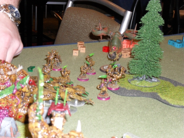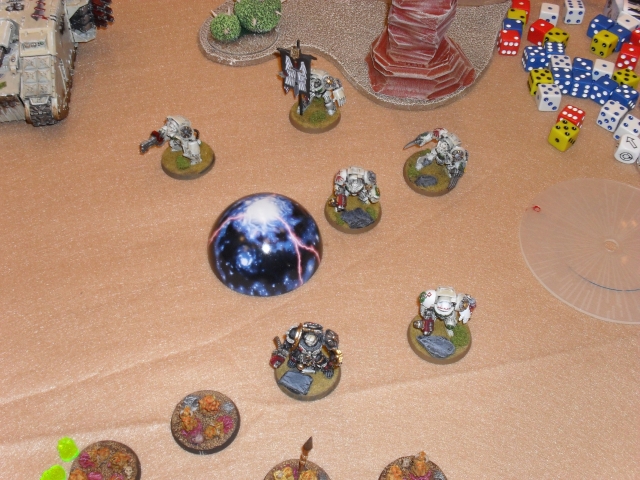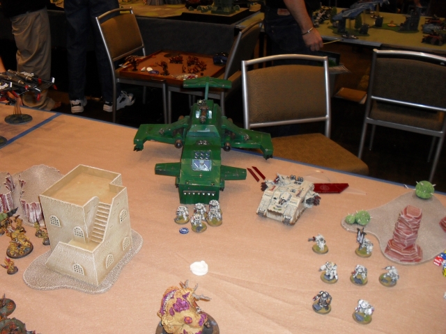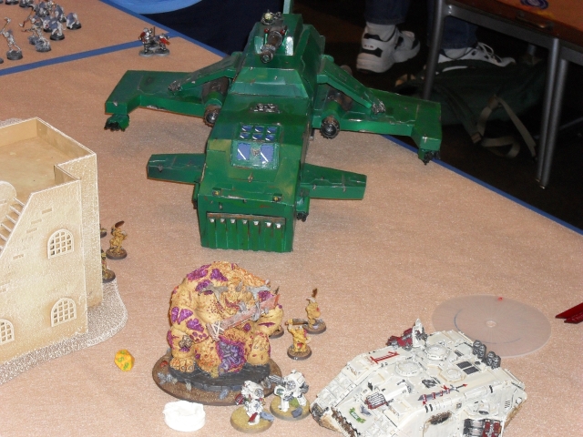 In turn two his Thunderhawk arrives as a skimmer and drops down the squad with the vortex grenade to threaten Scabbiethrax. His vortex misses, but his turbo-laser knocks off a couple of Scabbie’s wounds. His crusader moves fast enough to move into contest range of the objective but doesn’t shoot anything.