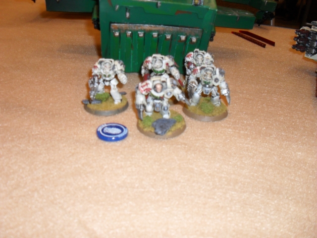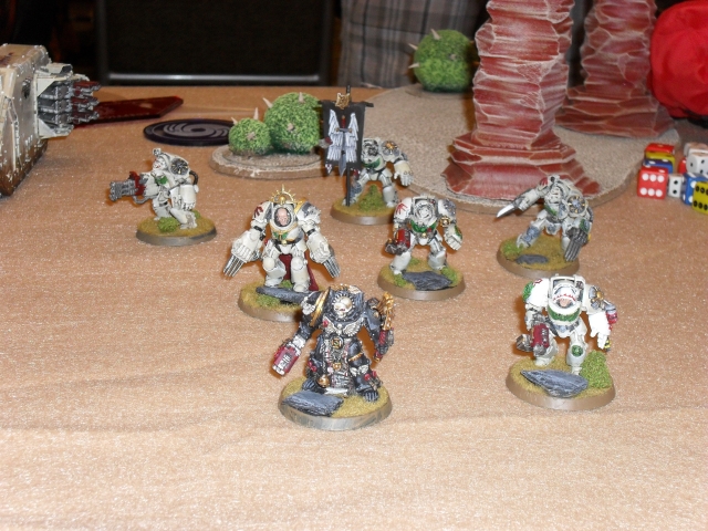 Evan goes first, deploying his terminator command squad with characters and his crusader. Both of the other Deathwing squads and his vortex grenade are in the Thunderhawk in reserve. He claims the objective in the first turn with his command squad (which eventually wins him the game) and then I deploy.