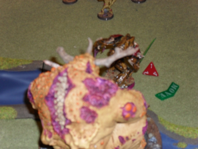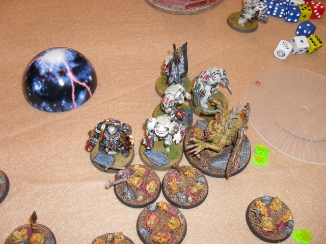 I made a boneheaded move and detached Epidemius from his squad so that they could charge into his Scabbiethrax to tie him down. Unfortunately, gargantuan critters don’t work that way (obviously I knew that, I just wasn’t thinking). On the bright side, I moved that tally up nicely. Scabbiethrax hunted down his wounded Daemon Prince. But if I recall correctly a couple of good ward saves on his part saved him for a turn.