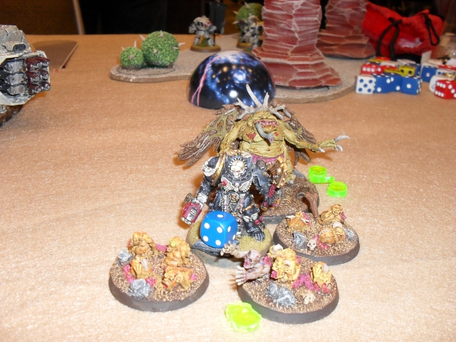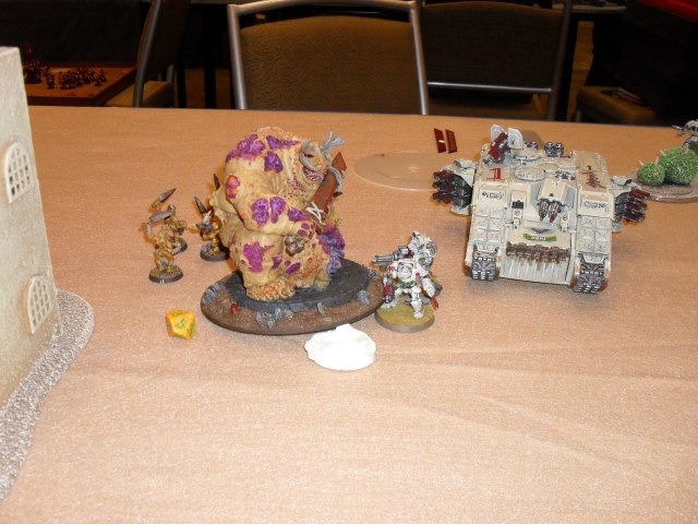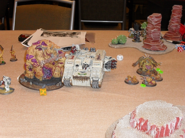 This is the type army I thought I’d see all day, so it’s good I finally saw it by round 4 of the tournament. The Blight Drones and Hulk proved able to open up transports and neutralize his artillery. Scabbiethrax ate a vehicle each turn he was on the table and absorbed firepower, which was pretty much his job all day. Epidemius wasn’t much of a factor, but I don’t really need his abilities pumping my Plaguebearers and Nurglings if all they have to fight are guardsmen.