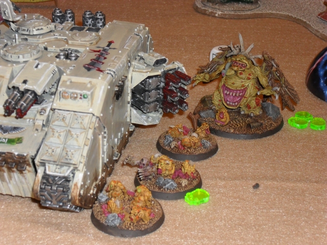 Scabbie eats another Chimera, but I only knock a couple guns off those Russes with the Hulk. The Nurgling squad that had been chewing on his company commander finishes him off and cpnsolidates towards an objective.