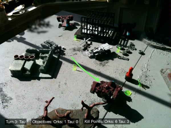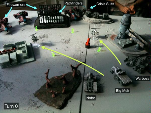 El Quixo breaks away from the Crisis Suits to land next to Morgrim's Trukk, while the Crisis Suits move to get a better shot. The Pathfinders open up on Morgrim's Trukk with Markerlights, reducing the