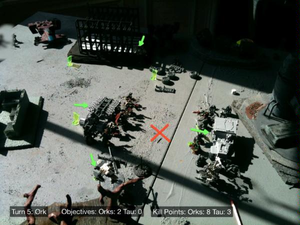 El Quixo though at the loss of the remaining two boyz. Morgrim exacted revenge on the Crisis Suits, insta-killing two in exchange for a wound, and then cutting the remaining one down before he could flee the field. Morgrim consolidated towards the Pathfinders and the lone Nob from his Taktical boyz consolidated back towards the north east objective and safety of the Trukk wreckage.