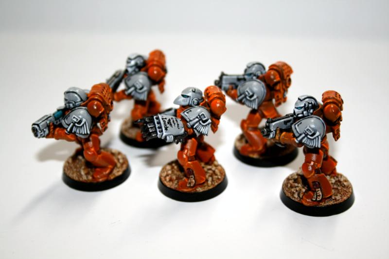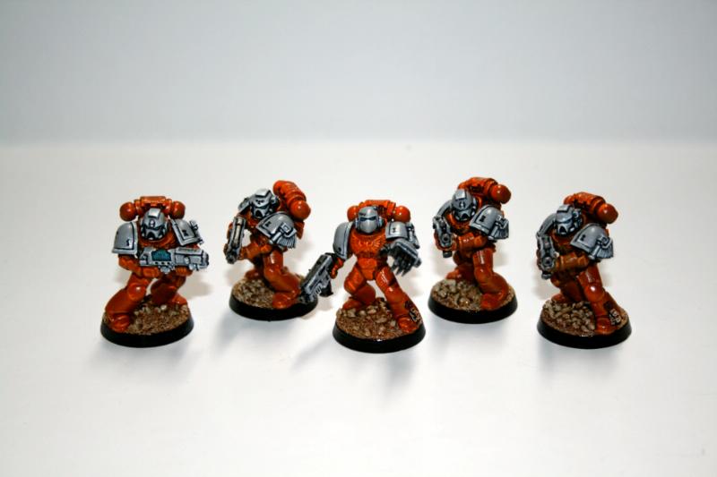 Thanks for the feedback fellas  The camera flash + the gloss varnish eat up alot of the shading, which is anoying :( On the WIP pictures you can see the shades of orange more clearly, as only the finished marines are varnished.