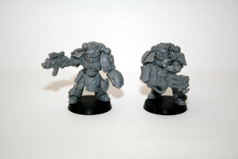 @TheFirstBorn : I used (and will use for the rest of the squad) the torso-plate from the marine weapons and ascesories sprue to give them that "tougher than tough" look and to unify them. Ill also use chaos marine bolters with the ammo feeds and added scopes to give their bolters a veteran feel. The sergeant has little viking-style wings on his helm made from a really tiny dark angel symbol I found amidst my bitz, dont know where its from tough. The powerfist is from a plastic terminator, tough I changed the actual arm to a power armoured one. The laurels im using on their right shoulder come from some old empire sprue, same as some additional tigh armour that everyone else except the sergeant has (you cant see it, but the flamer marine has them and so will all the bolter marines). The sergeant has another laurel on his knee from the terminator box and everyone has a small crux terminatus on the inner corner of their left shoulderpad that is also from the terminator box.