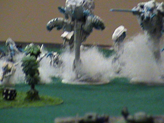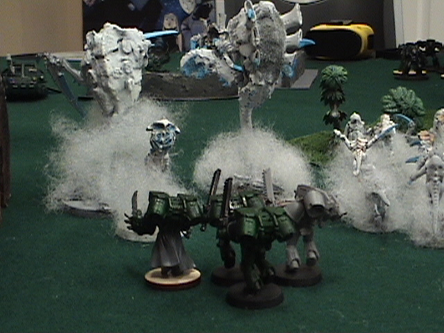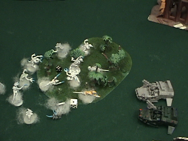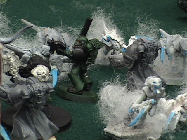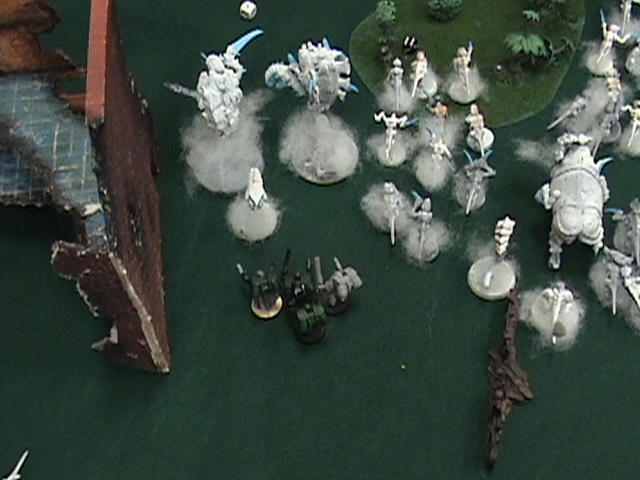 The BA and slightly over extended the fast rhino and I intended to make them join the ranks of the dead. Up comes the two hive guard, Cant move or shoot... Well you can't penetrate with ghost guns so... The trygons move up. one aims for the speeders and is out of range. The other aims for the terminators for no damage. The tervagon gives the wounded Trygon FnP after spitting out 12 more babies, and misses it's shots at the terminators the Marloc attempts to land under the snipers, but scatters right between the Terminator squads and only kills two from the mixed weapon squad Not good....