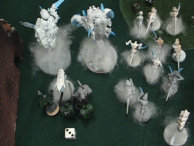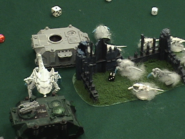 The BA Move in for the kill. The rhino moves up and pops smoke, and the snipers, terminators, WW, razorback, open up. wounding a hive guard once and a trygon twice, this ends their turn.