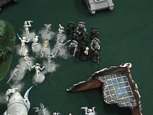 Nids, OK I'm being whipped and hard, but this game isn't about out killing but out claiming. My Hive tyrant has the upper left with his gant brood, and my lower left is held by the 5 man gant squad, The dead must simply endure. Unwounded trygon assaults the mixed terminators squad, only one brave SS terminator remains after passing way to many saves.