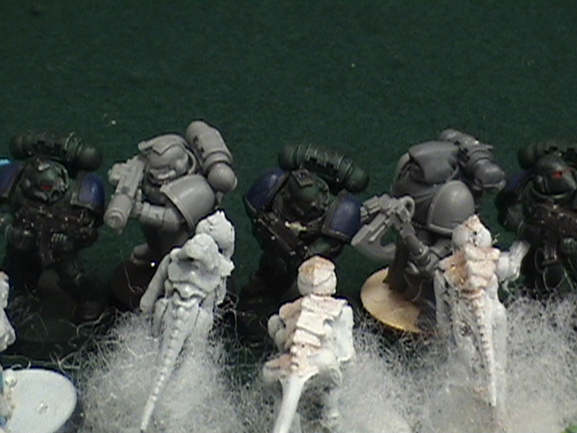 The ghostly spectres move up in complete silence, unheard screams of rage for the living in their throats. lesser men may have broken but not the Blood Angels, their rage fully in control. Most shots are lost in the mist generated by the otherworldly fog pouring from the Venomthropes, although two of the ghostly beats seem to appear less corporal after blessed shots of bolter fire. The mawloc evaporated into mist that blew away without the need for wind