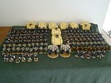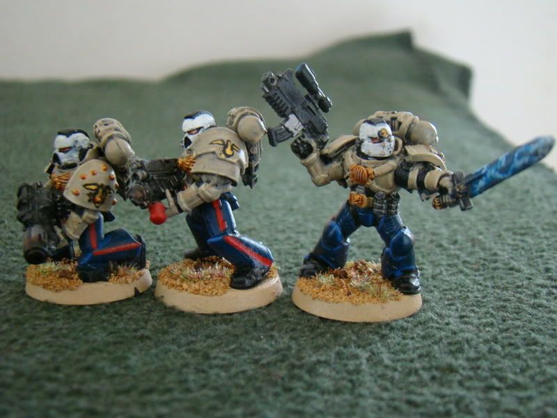 The Dress blues are basic uniform for all. Officers keep black legs as well. Vets ie Sternguard and Dreads get "charlies" , and Honor Guard get Whites and Relic Blades(bayonets) Envision Marneus Puller and 30 honor guard marching out of a Thunderhawk onto the objective. I put them on tan bases to make the uniform stand out so now the vehicles get tan theater scheme. Their Landspeeders and T-Hawk will be light Grey. Haven't figured out a color for drop pods...any ideas?