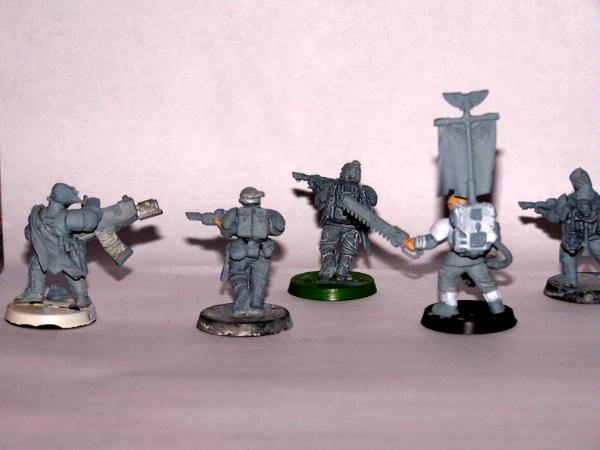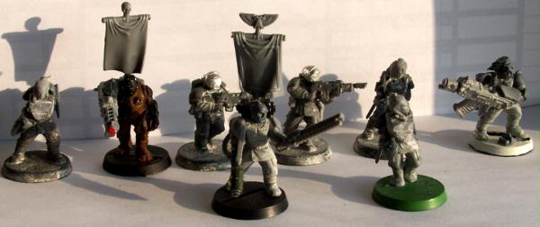 Some were damaged attempts at stripping paint (it is the reason I chose them for this rather than keeping them in my IG army). The rest were misc parts I wanted to use up from my bits box. I removed mould lines on most of them, as well as trimming off the worst of the damage after these pictures were taken. Those were just the preliminary stage.