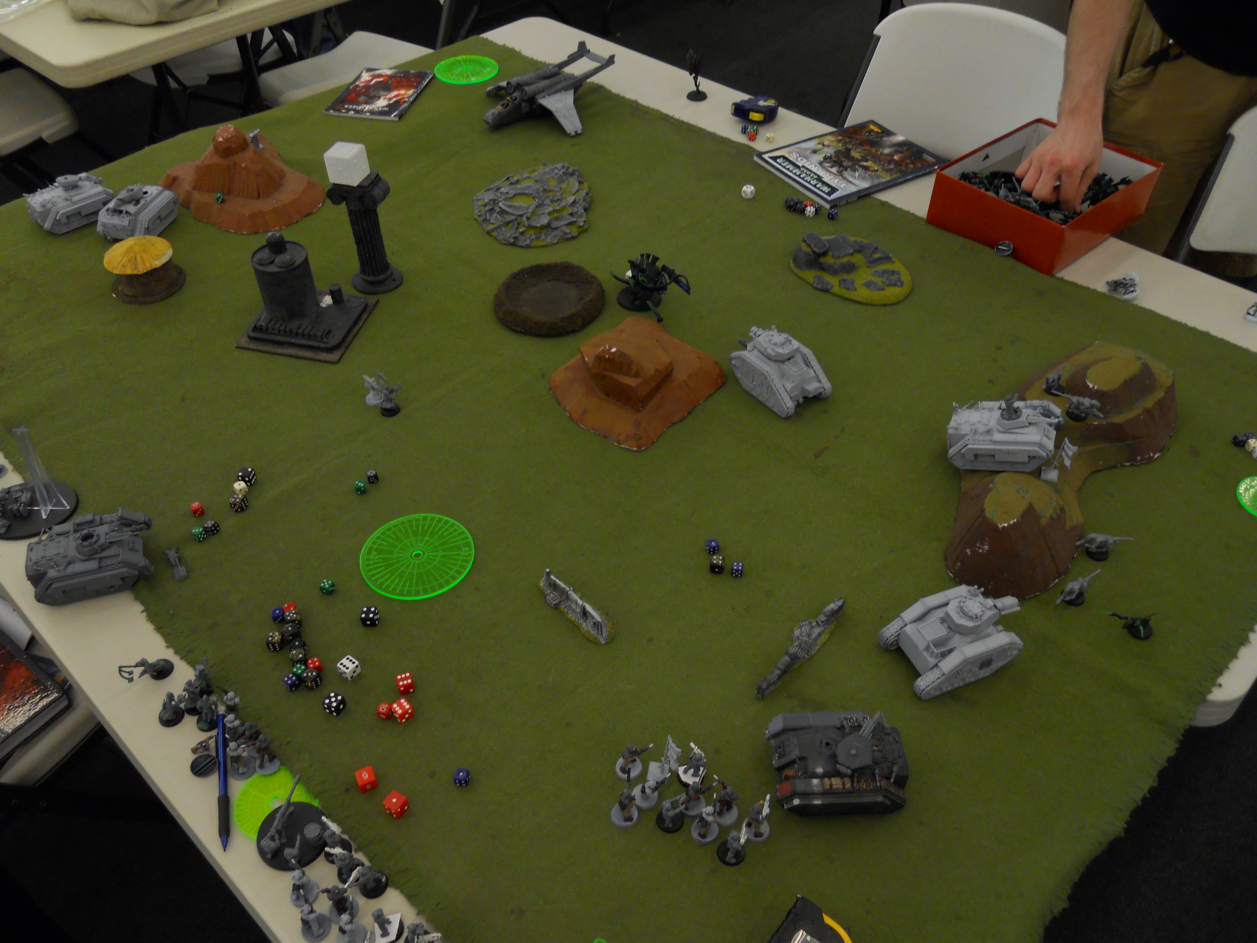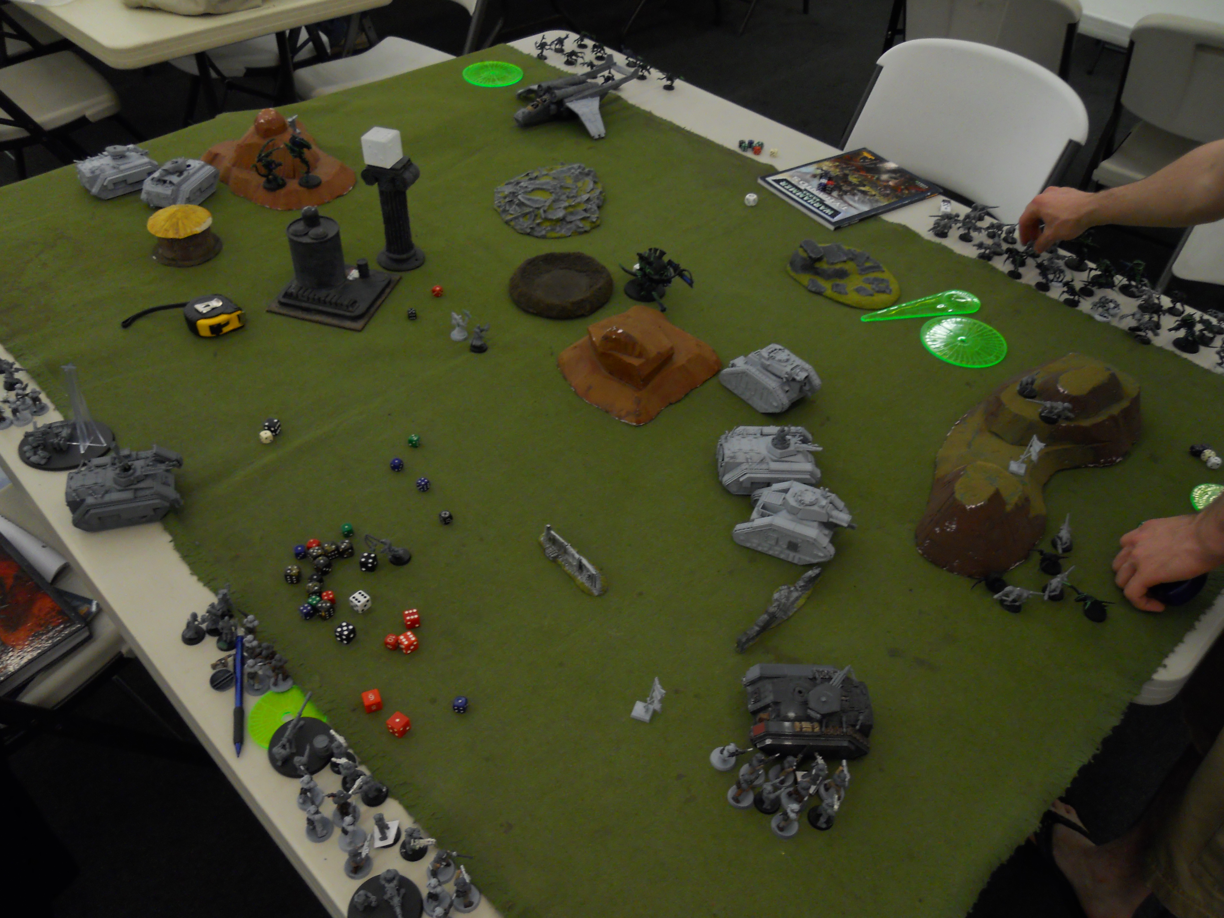 A quick summary this game was really quick i had alot of fun and my opponent was a great guy. I started off in a standard armoured line. His genestealers flanked and wiped out both my autocannon squads. My PBS was the greatest player in the game who held the tyranofex for 2 turns. My valkyrie wiped the genestealers off his back objective. Then I used my chimeras to contest his objective. Wiping out his warriors left his termagaunts go useless. His doom was horrible where it wiped out all my troops choices on my left side. My demolishers really didn't do much they scattered alot.