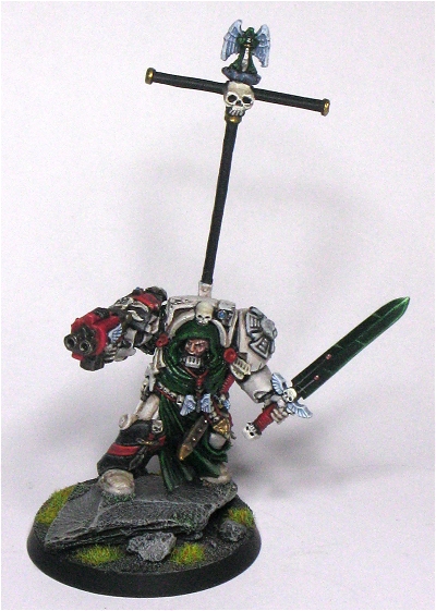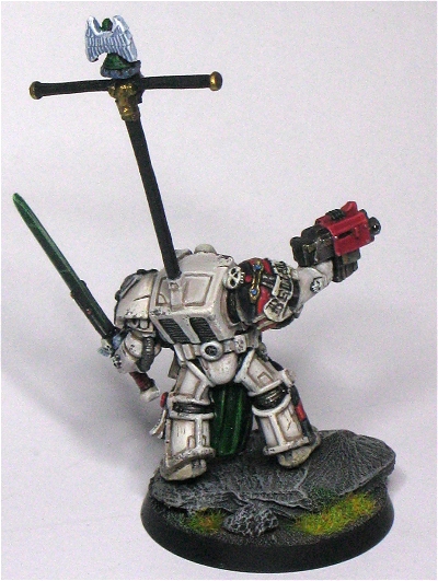 Done as a conversion of a standard Terminator Captain metal miniature. The metal figure is substantially smaller than the modern plastic Terminators, so he's been mounted on a largish piece of slate to bring the height up a bit. Combined with the banner he's imposing enough. The robe and heraldry has been sculpted with greenstuff. The skull on the banner pole was also sculpted, to cover where the feet of the Eagle that was removed from the pole were.