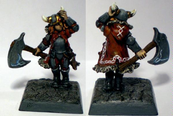 I didn't use metallics to paint her armor or axe (used metallics on the helmet however) mainly because I felt the model was too small to make them work, if that makes any sense. I started off using GW metallics but the model didn't carry it well and I switched to something I hope isn't too pretentious to call NMM =D